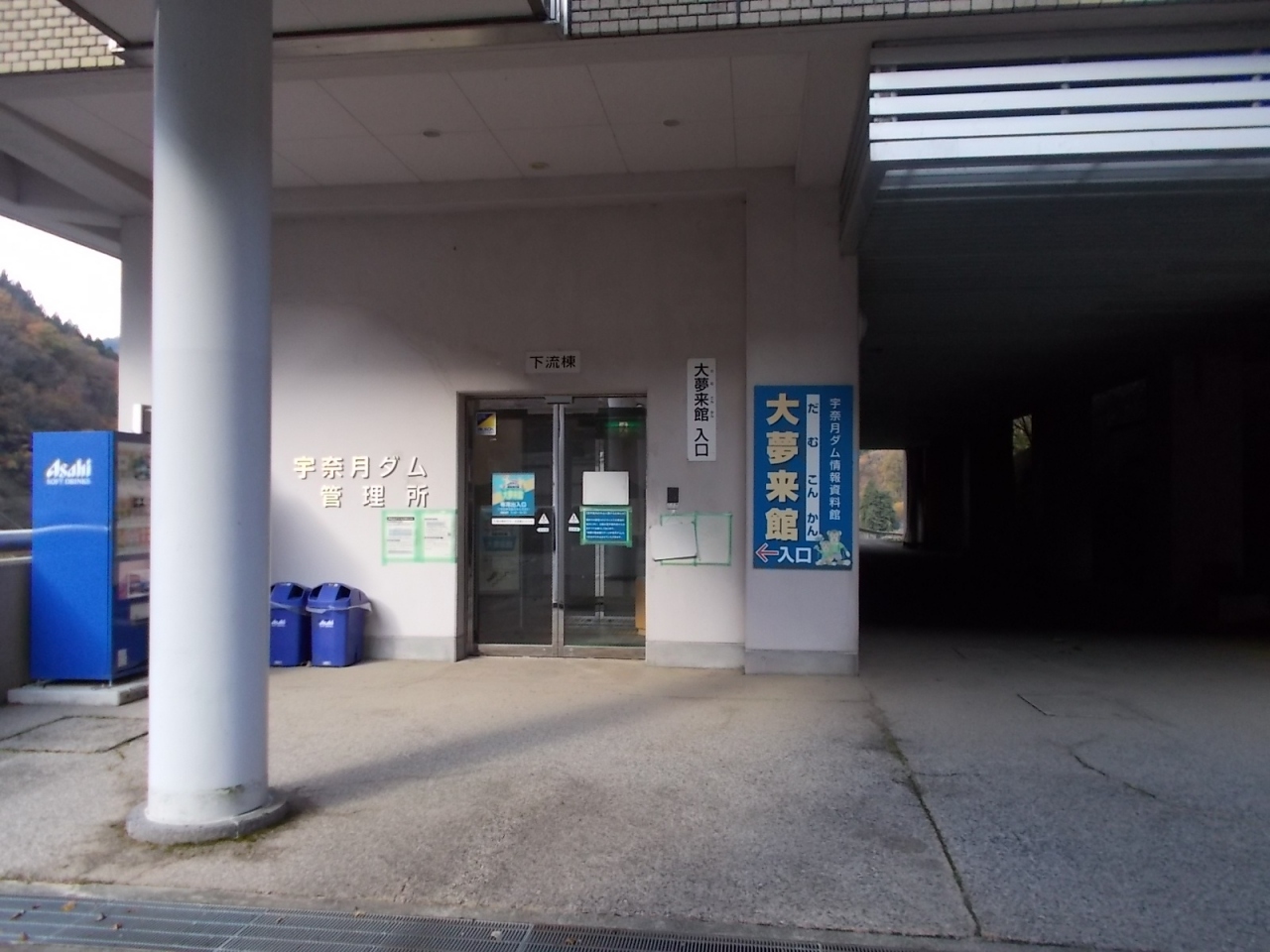 宇奈月ダムの管理所の建物内にある資料館。玄関で靴を脱いでスリッパにはきかえ、階段で2階に上がって見学することになります。受付等はなく常駐の管理人もいません。入館無料です。自分が訪れたときは、ほかに見学者はいませんでした。