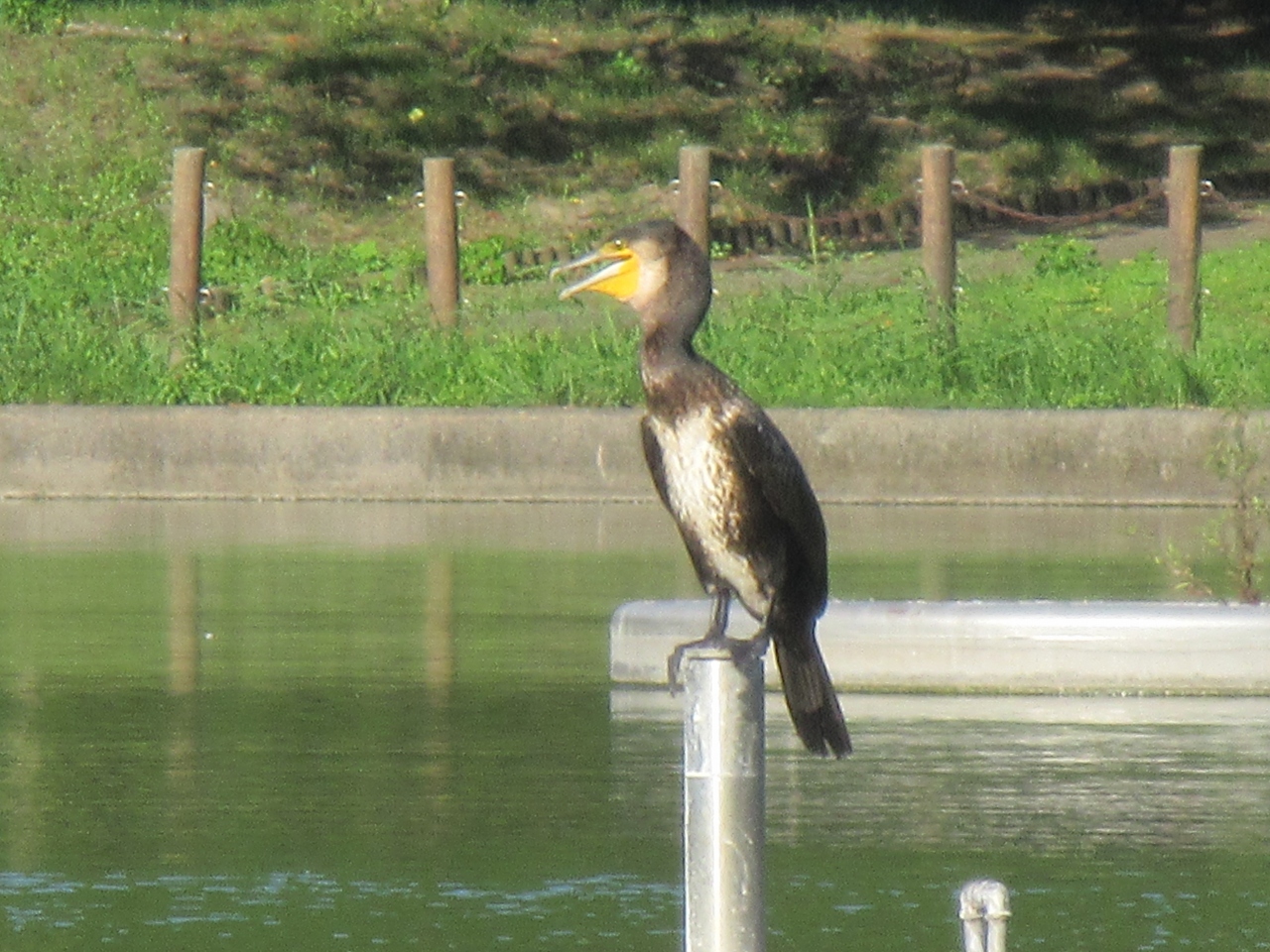 野鳥は、アオサギ、カワウ、マガモなどが。いました。花は少なくて、ムクゲなどが見られました。(アオサギではなく、ゴイサギでした!)