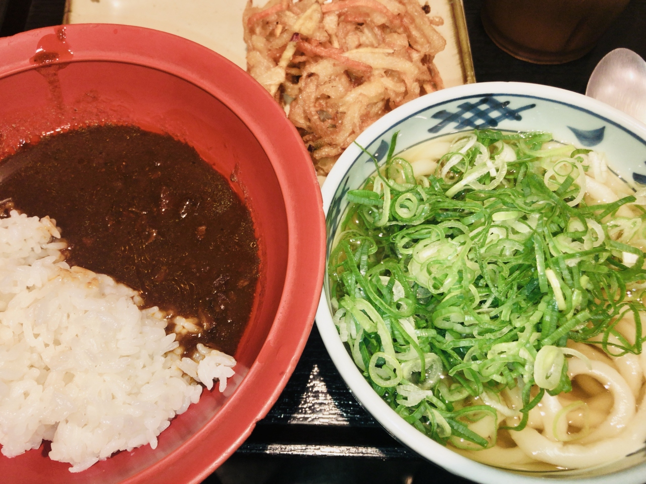 「カレー朝食」を頂きました。かき揚げか温泉たまごが選べます。青ネギと天かすはフリー。