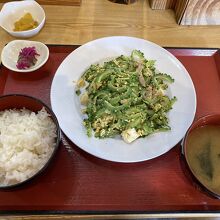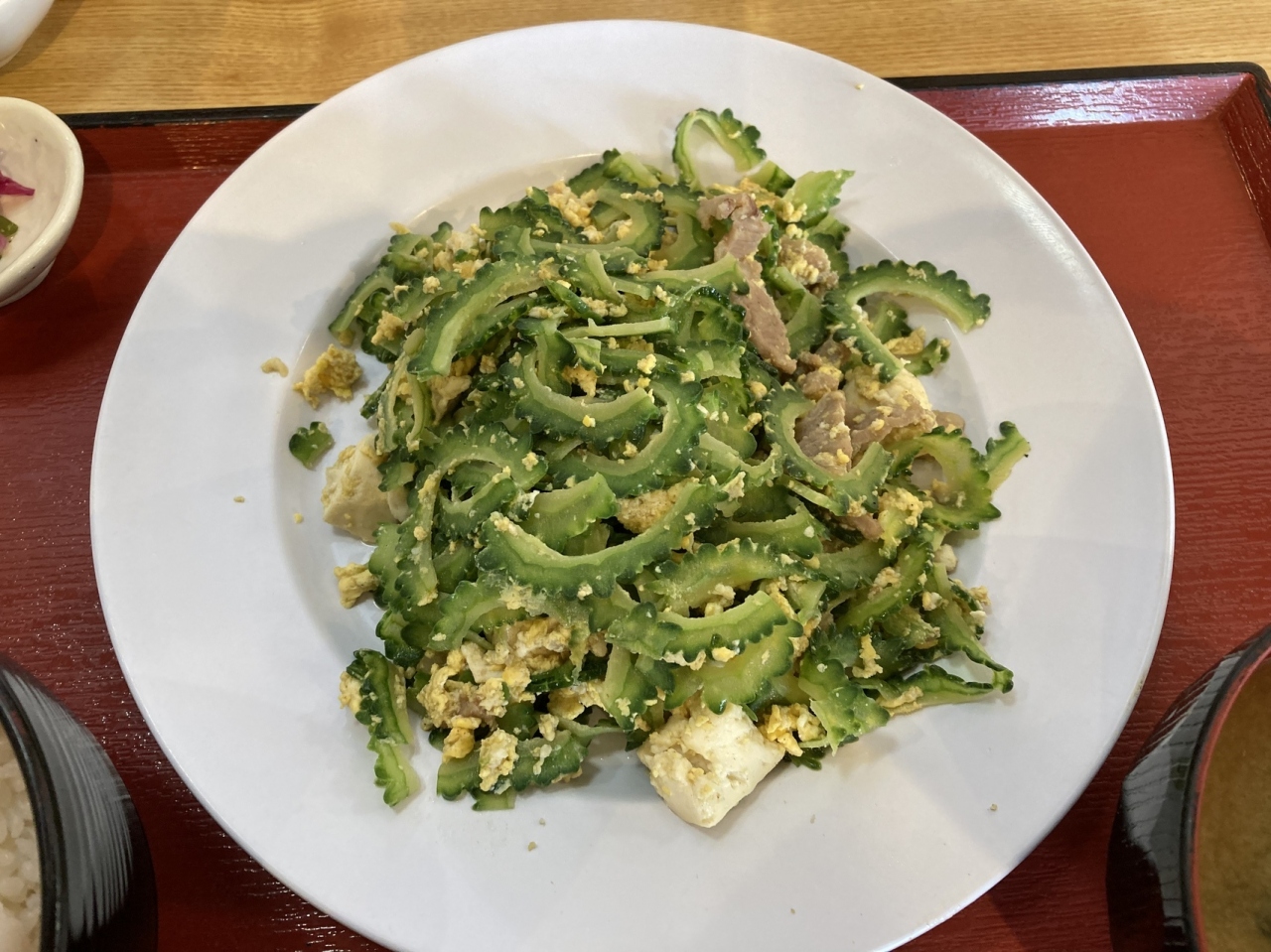 今回は、沖縄料理の定番メニュー「ゴーヤちゃんぷるー定食」をオーダー。お皿は緑色のゴーヤで埋め尽くされていますが、油で炒められたゴーヤは程よい苦味とお豆腐、卵で、うまくまとめられています。味がしっかりしているので、ご飯が進みます。もちろん満足感は高く、一気にいただけました。