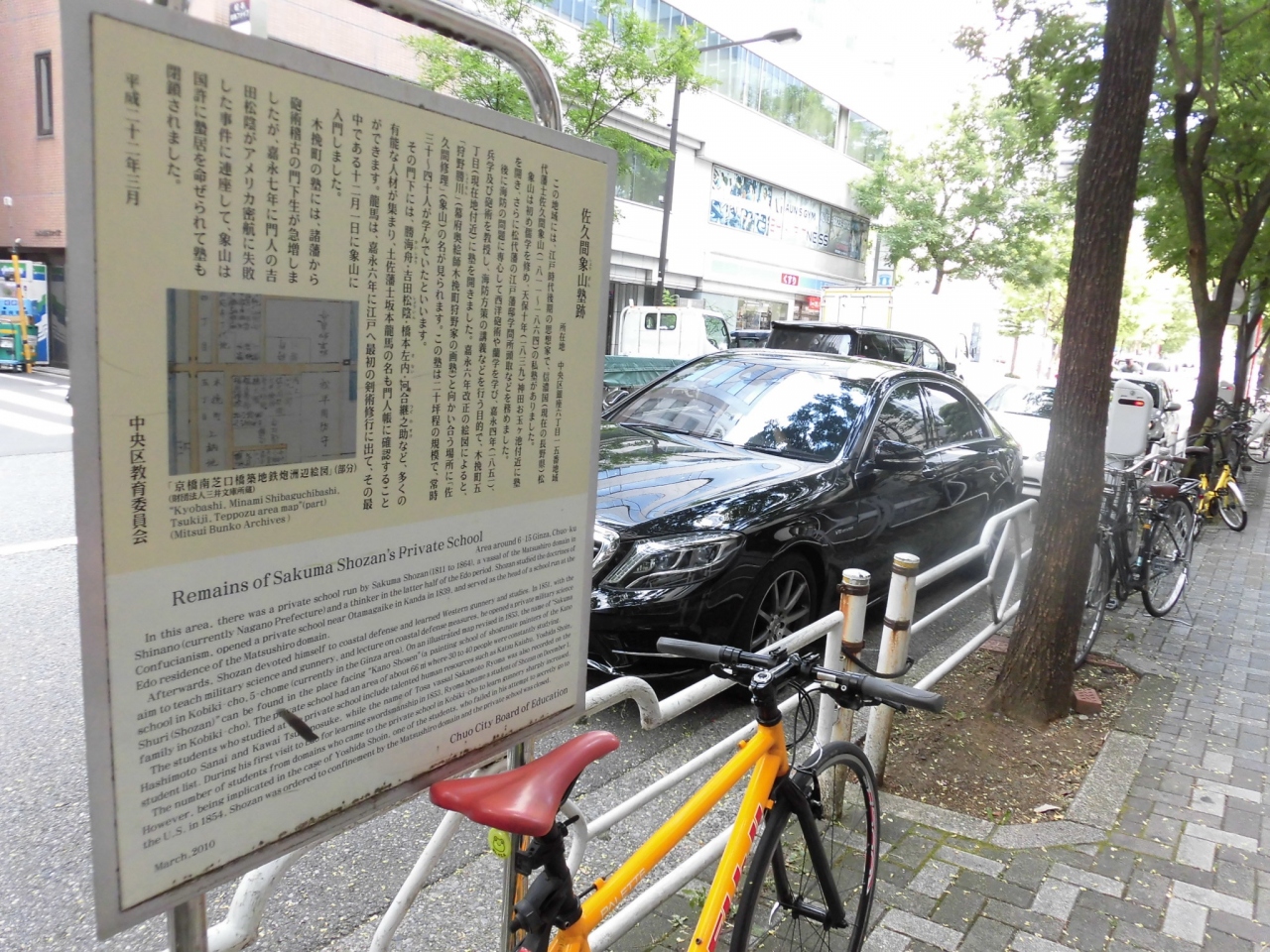 銀座周辺を散策していた時に、6丁目のみゆき通り沿いに、案内板を見つけたので立ち寄ってみました。江戸時代に佐久間象山の塾がこの場所にあったことが記されていました。門人として勝海舟や、坂本龍馬、吉田松陰など、有名な人々がいたので、当時、この辺りを歩いていたのかと想像するだけで、なんとなく嬉しくなってしまいました。