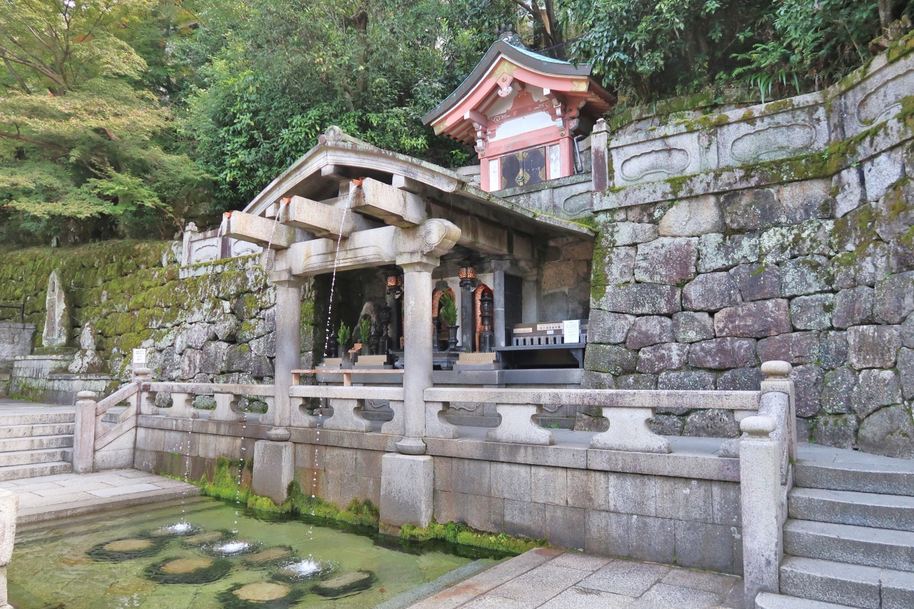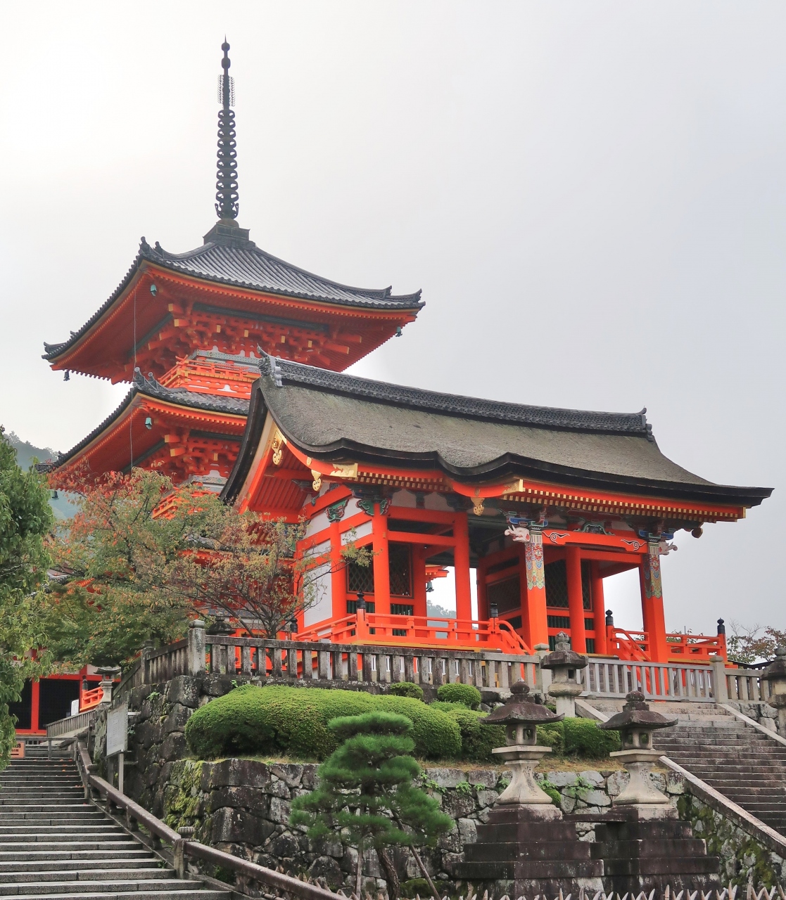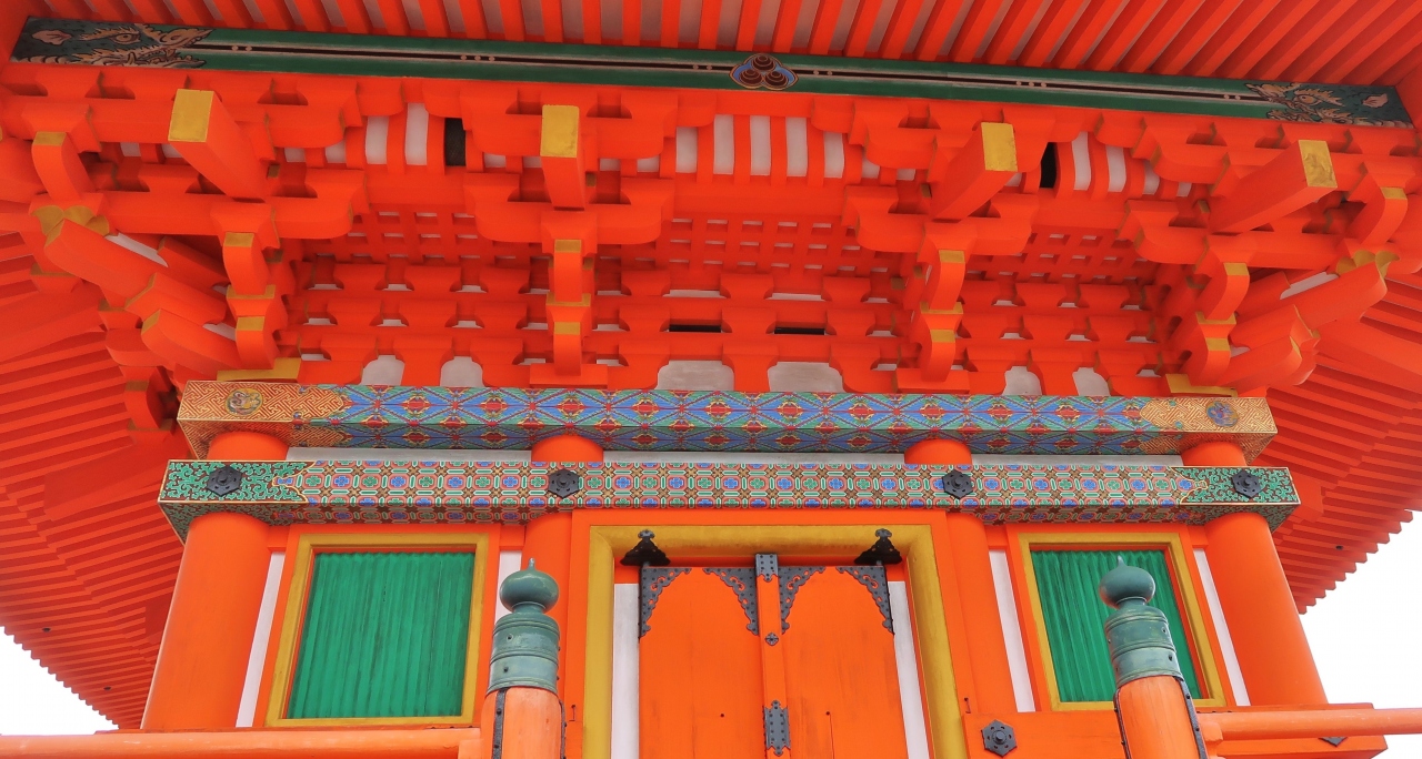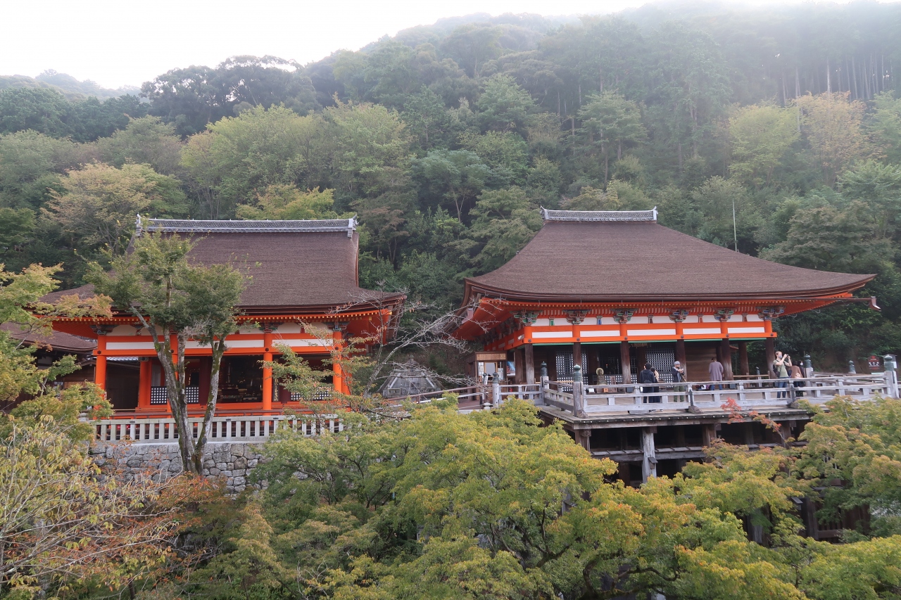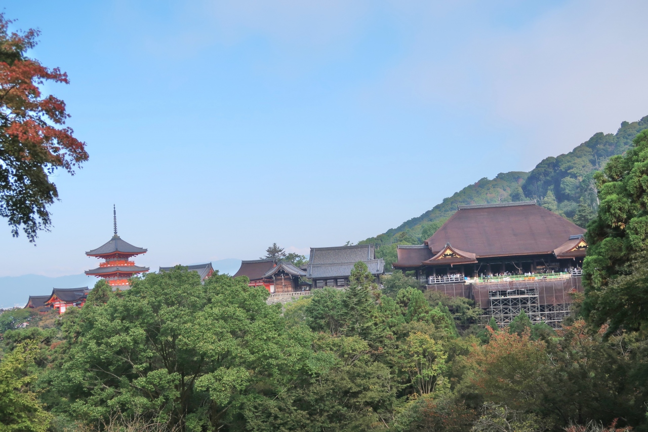 京都の世界遺産巡りは、やはり王道の清水寺からスタートすることにしました。早朝6時から開門していますが、8時過ぎでもほとんど人の姿はなく、団体客が到着する8時40分頃からだんだんにぎわってきました。無料エリアの西門や三重塔にあしらわれている蟇股の彫刻や極彩色の緻密な文様が美しく、印象に残っています。最大の見どころの清水の舞台が修理中で見ることができず残念でしたが、子安塔のあたりから伽藍が立ち並ぶ景色を遠望することができました。
