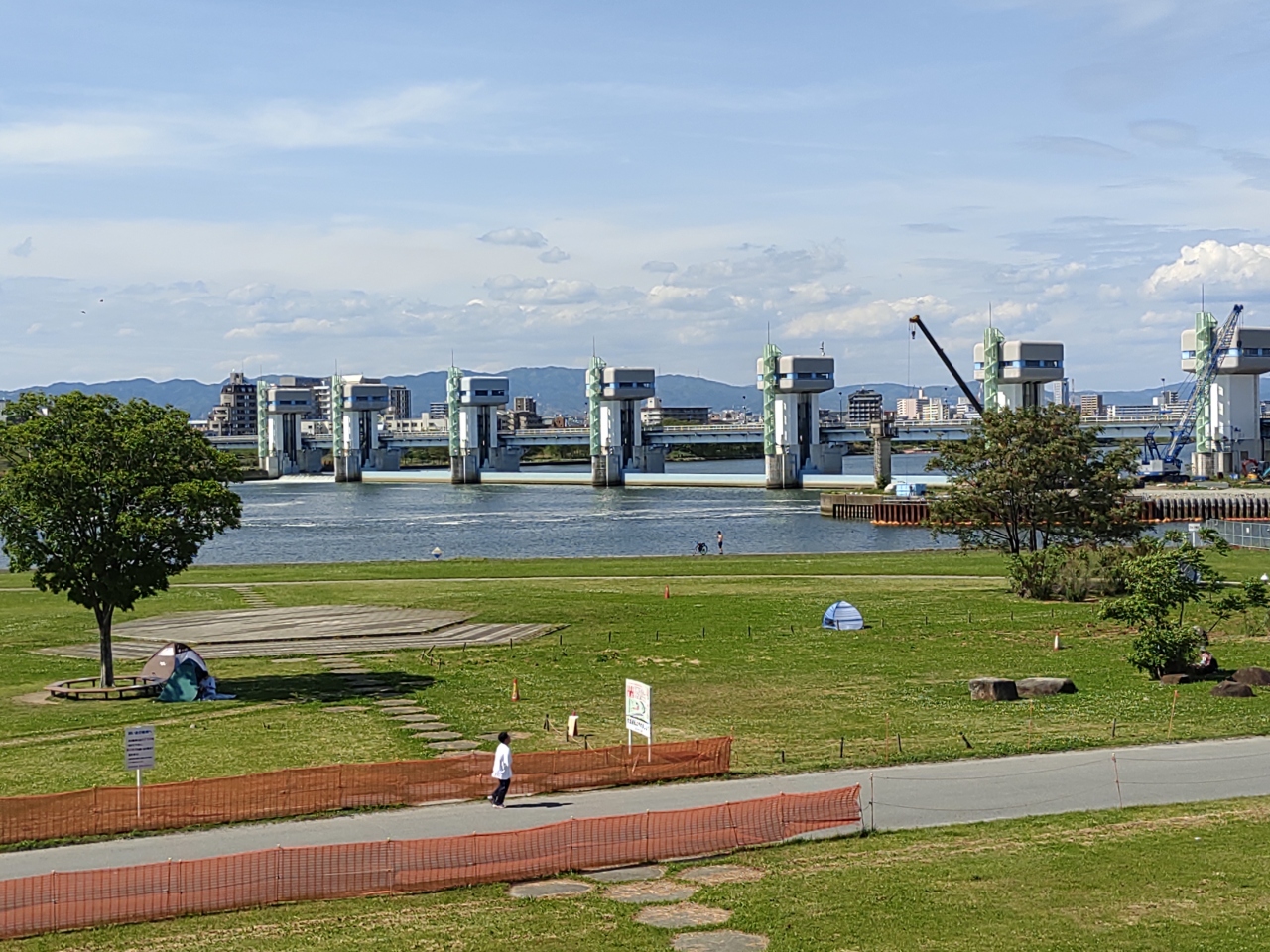 淀川東岸・毛馬にある大きな水門。水門の先は桜ノ宮や中之島を流れる「大川」となります。青い大きな水門はリニューアルの工事中のようでした。一体は公園になっていて、水門の先、淀川には巨大な「淀川大堰」も見ることができます。