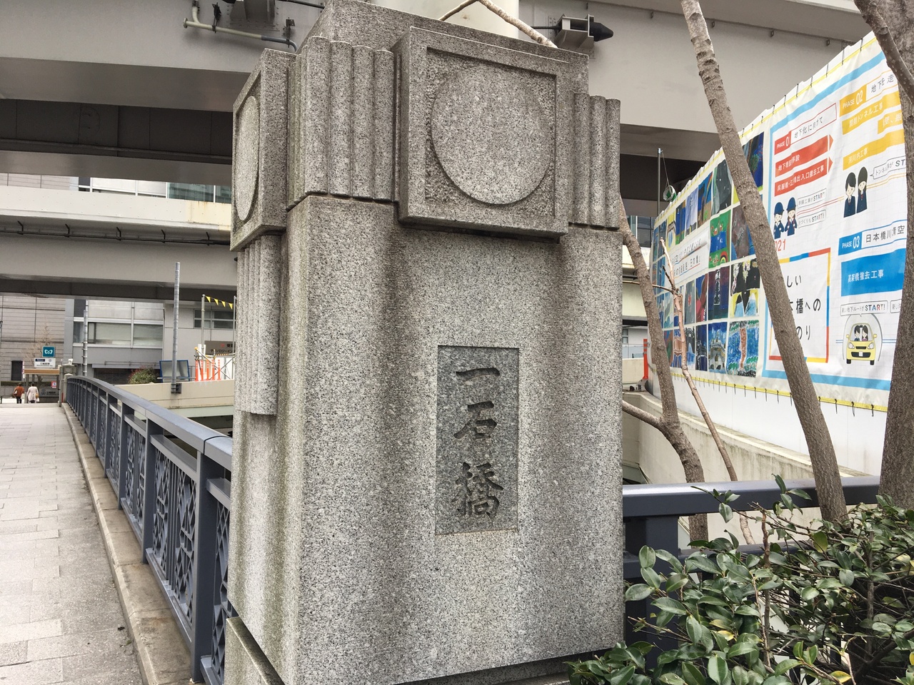 東京駅から日本橋エリアに向かう途中に、石造りの立派な一石橋を通りました。一石橋はもともと木製の橋だったそうで、大正時代に鉄骨コンクリート花崗岩張りの橋になったそうで、その当時の姿を残す花崗岩の親柱が残されており、中央区民文化財に指定されています。