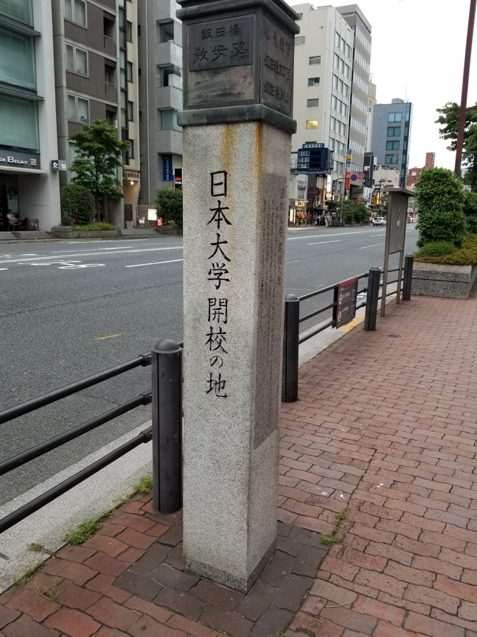 通りには多くの歴史の標柱や地図版が並んでいてそのなかに日本大学開校の地がある。