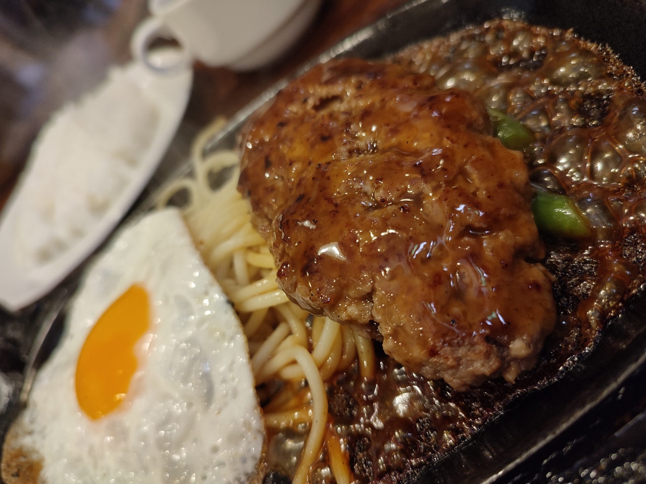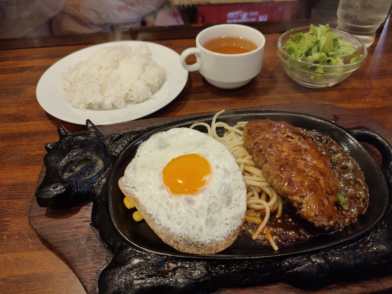 目玉焼きの乗ったハンバーグ、いいですね。ライスのお替りができます。サラダもついているのでコスパがいいですね。