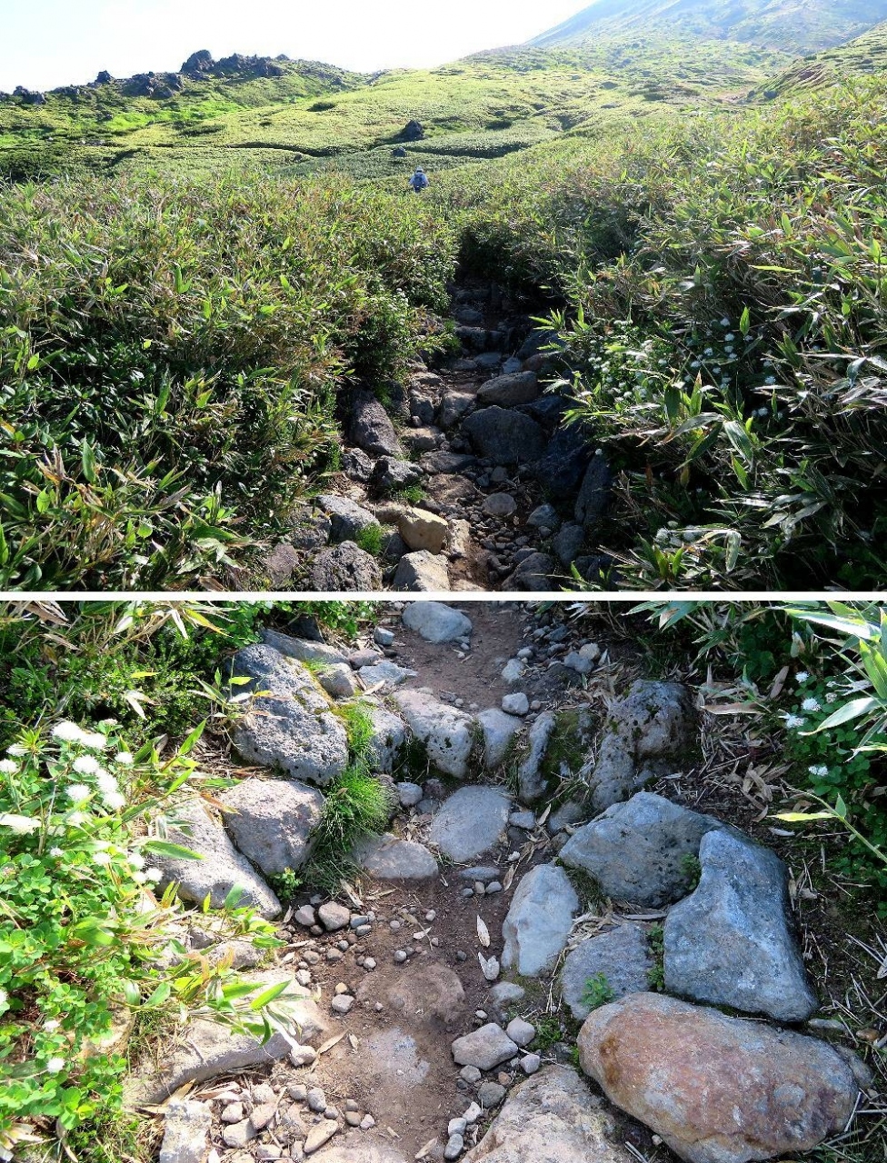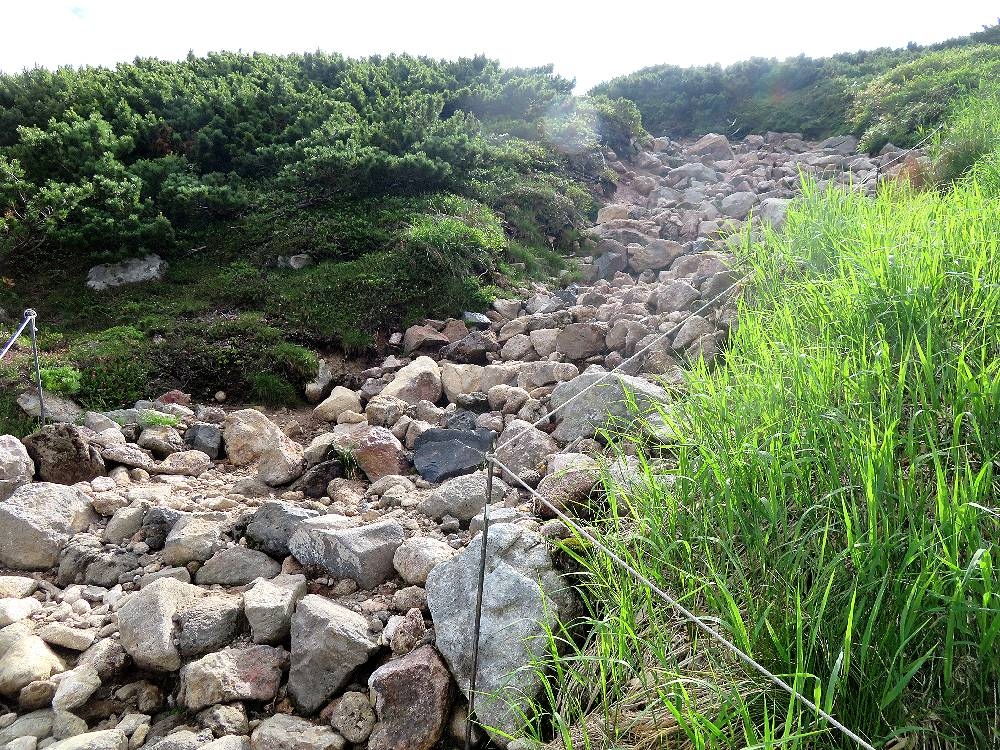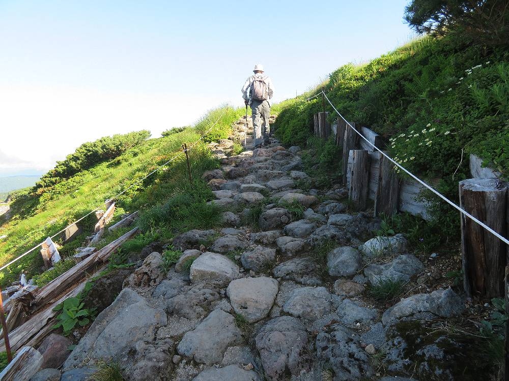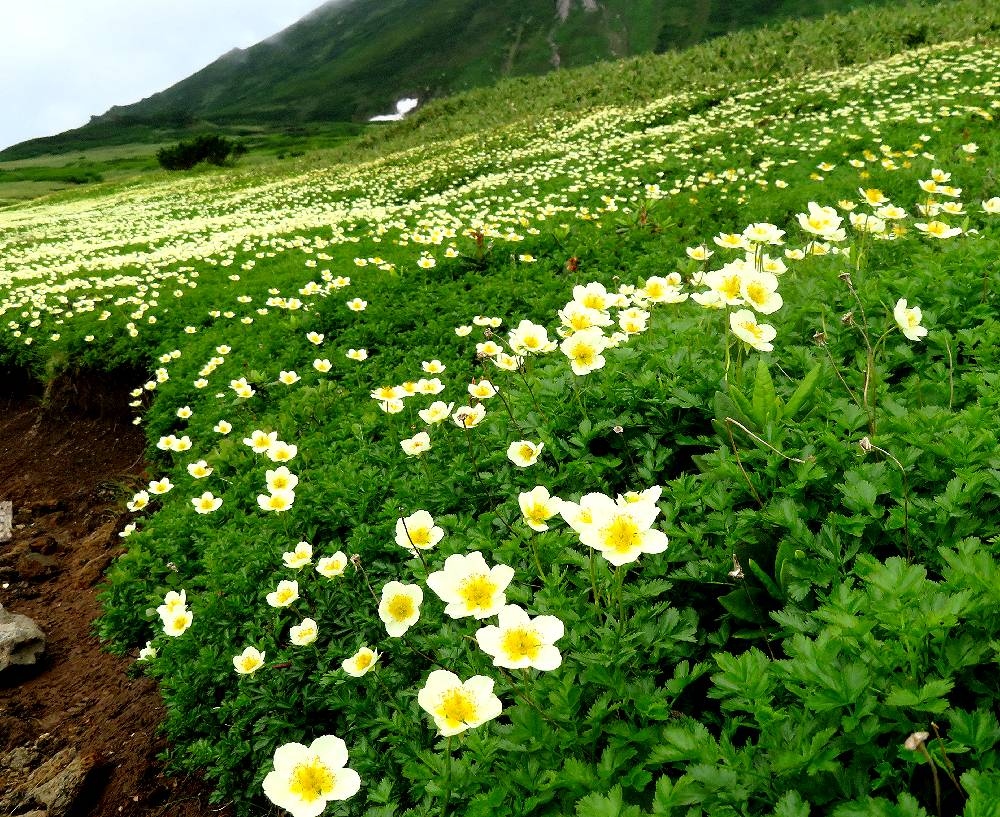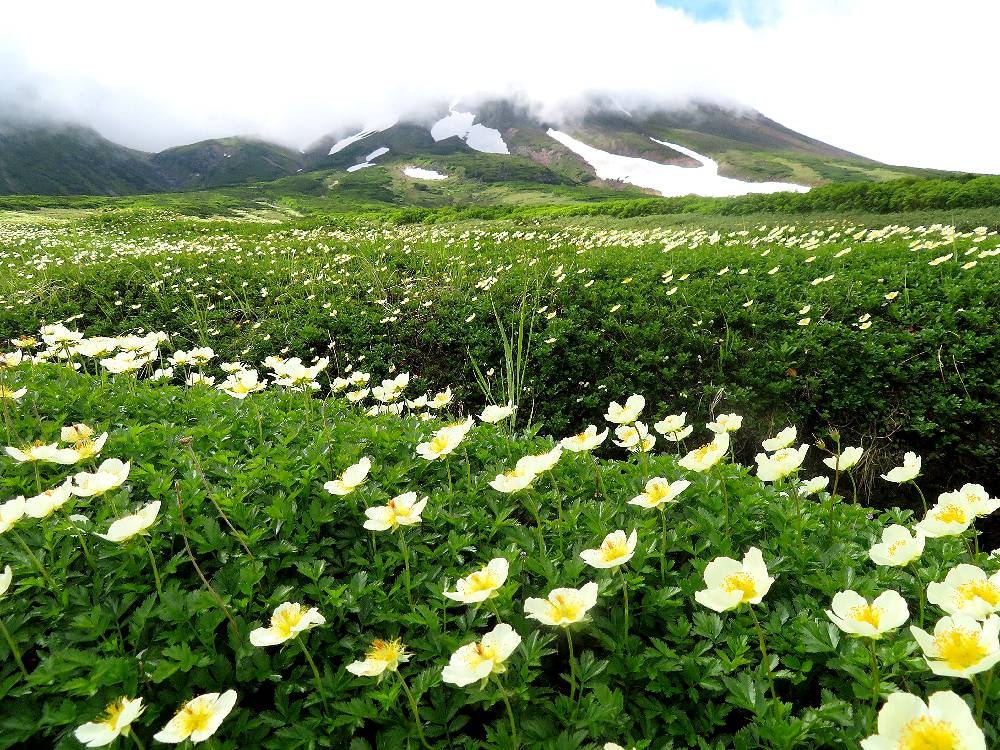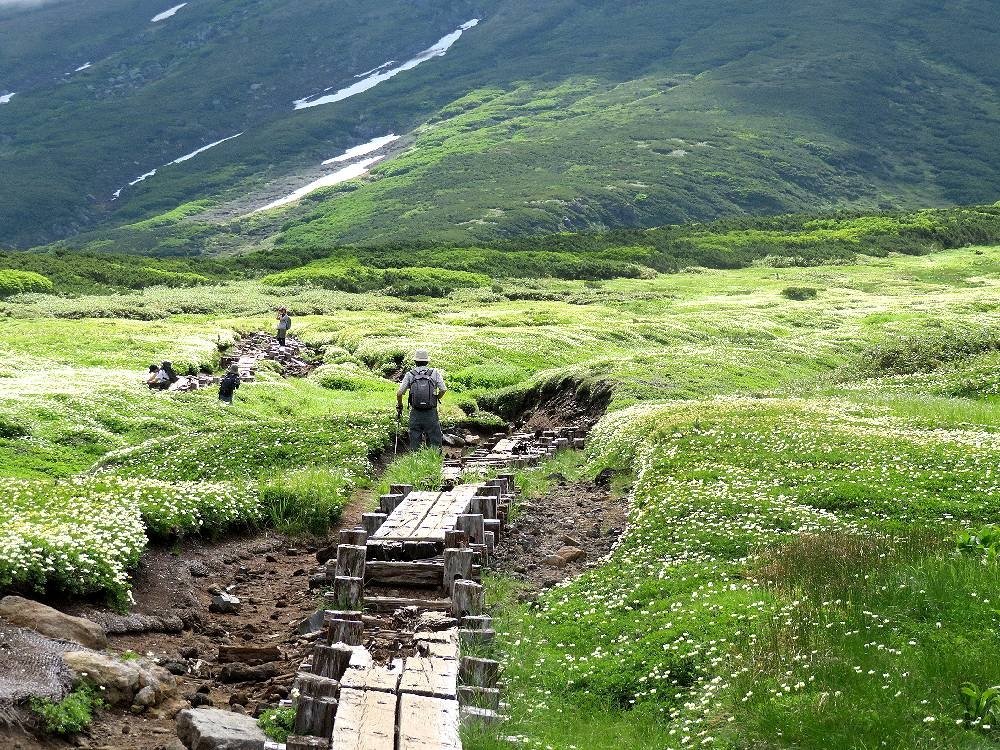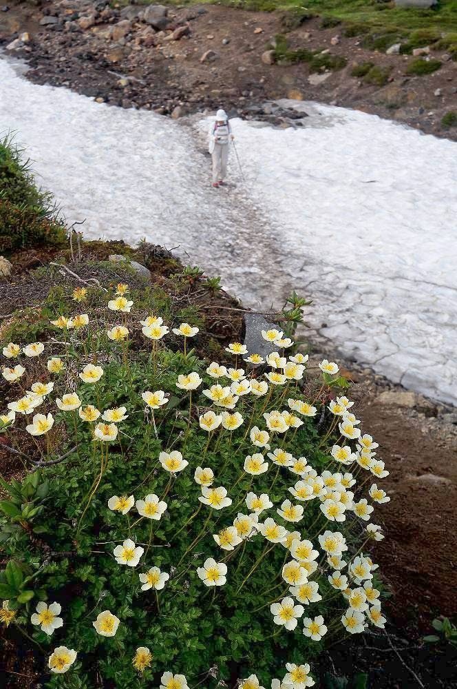 7月22日の梅雨の晴れ間にチングルマを目当てで訪れました。7月に入り、チングルマが咲き始めるころはずっと雨の日がつづき、辛うじて2日連続で晴れマークがついたので、急遽訪れました。考えるのは同じで多くの登山客が訪れていました。ロープウェイの姿見駅から裾合平分岐まではたったの3.8キロしかなく、標高差も約90メートルしかありません。道は迷うことのない道ですが、途中アップダウンが多くあり、石ころだらけの道もあったり、4カ所雪渓上を歩いたり、木道が朽ちて歩けなかったりと、結局、片道2時間の本格的な山歩きになりました。行程の半分も行かない途中で、ガイドさんにこれ以上は無理と引き返すことを促されていたツアー客たちもいました。きちんとした登山靴と登山用ストックは必須だと思います。
