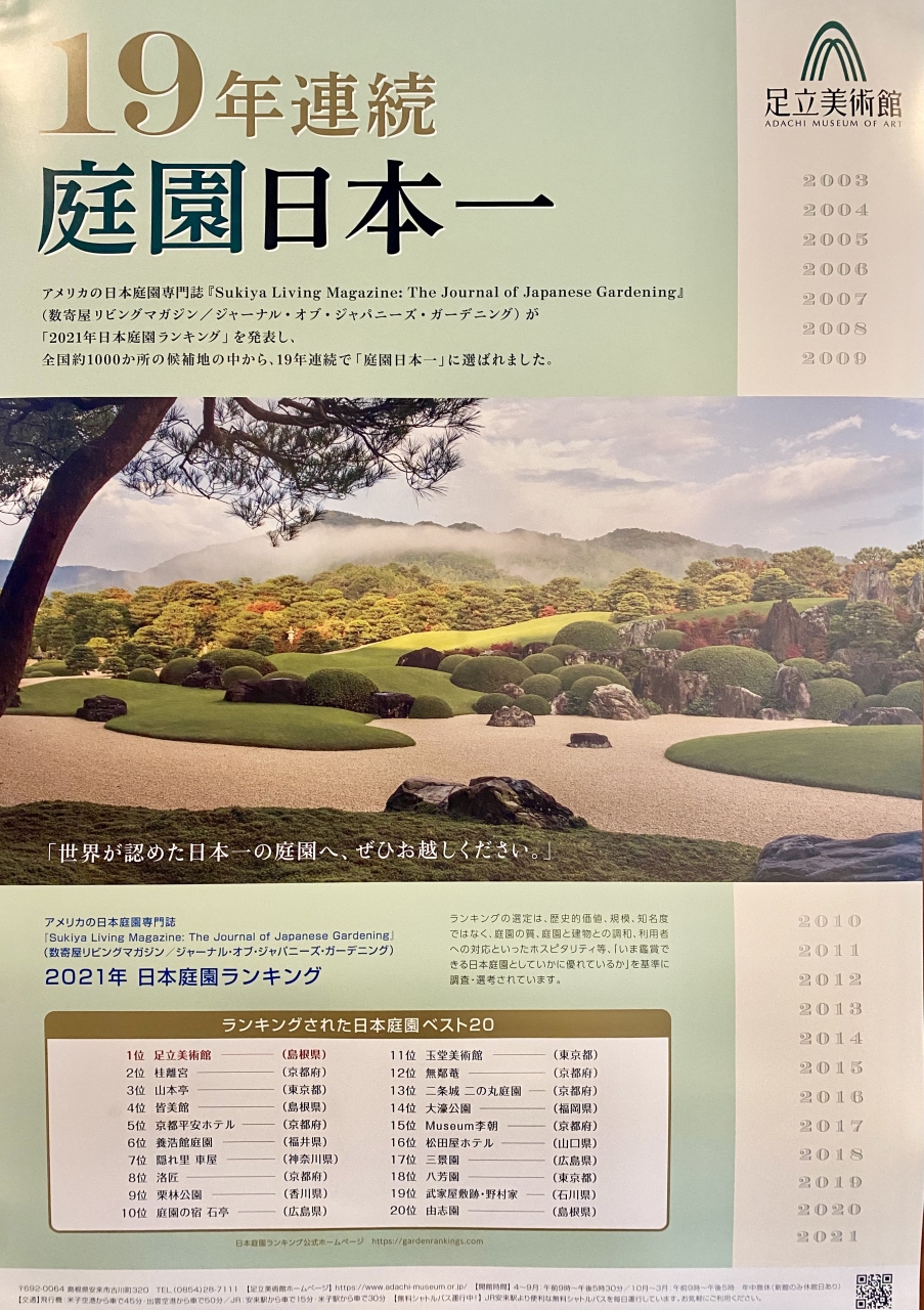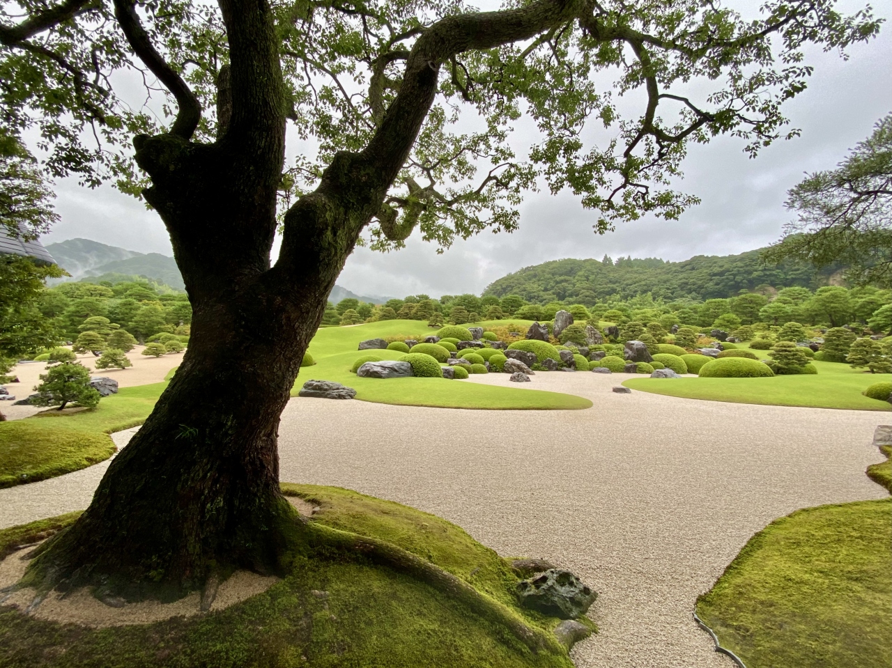 入るといきなり庭園が見え、庭園が有名なだけあって素敵です。創設者足立全康氏の銅像がありましたが、「庭園もまた一幅の絵画である」という言葉を残すくらい庭づくりへの情熱が素晴らしいので、手入れにも費用がかかるでしょうね。枯山水庭は背景が借景となっており、足立美術館の主庭です。19年連続庭園日本一って凄いです(京都の桂離宮などを抑えてですから)。