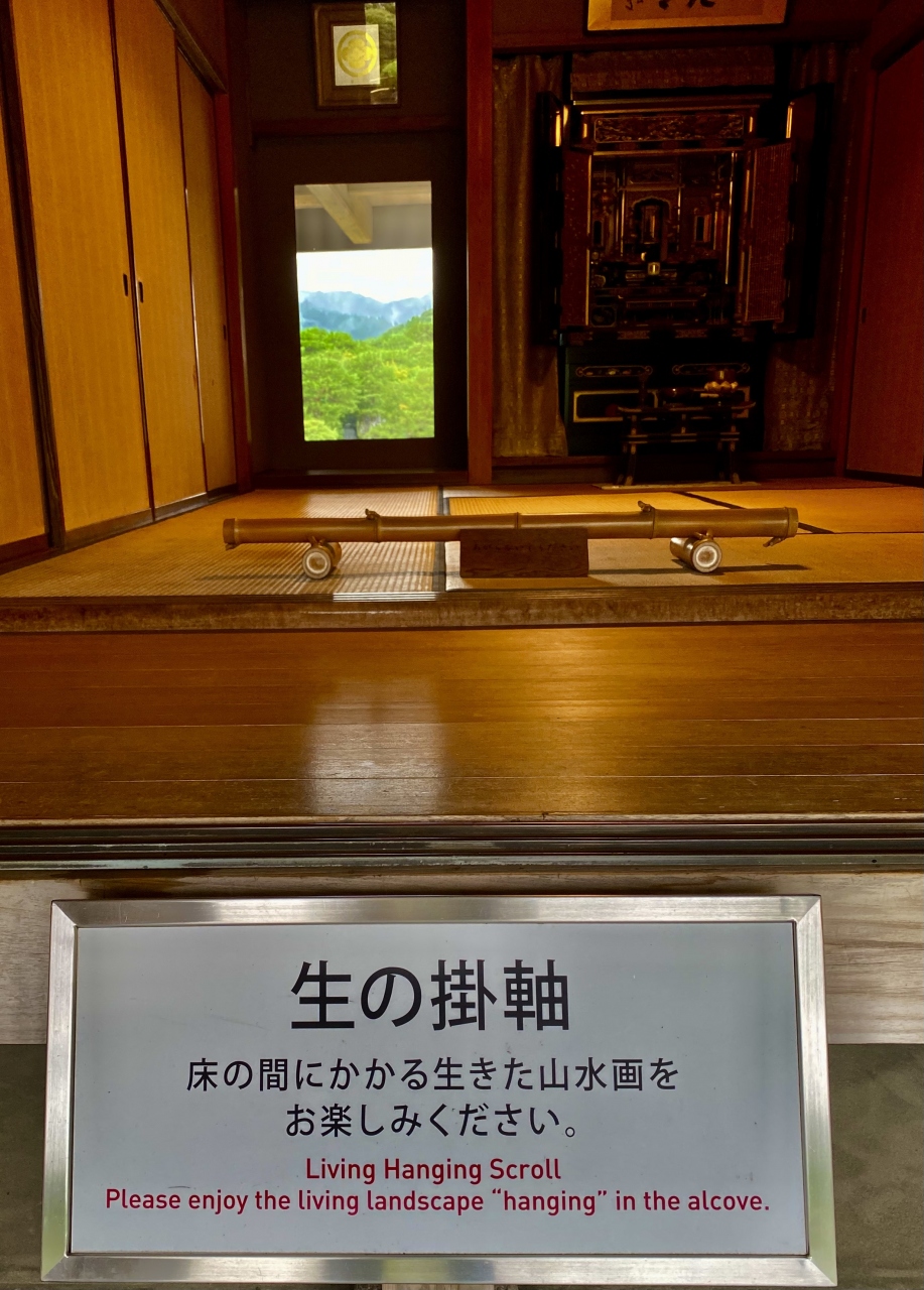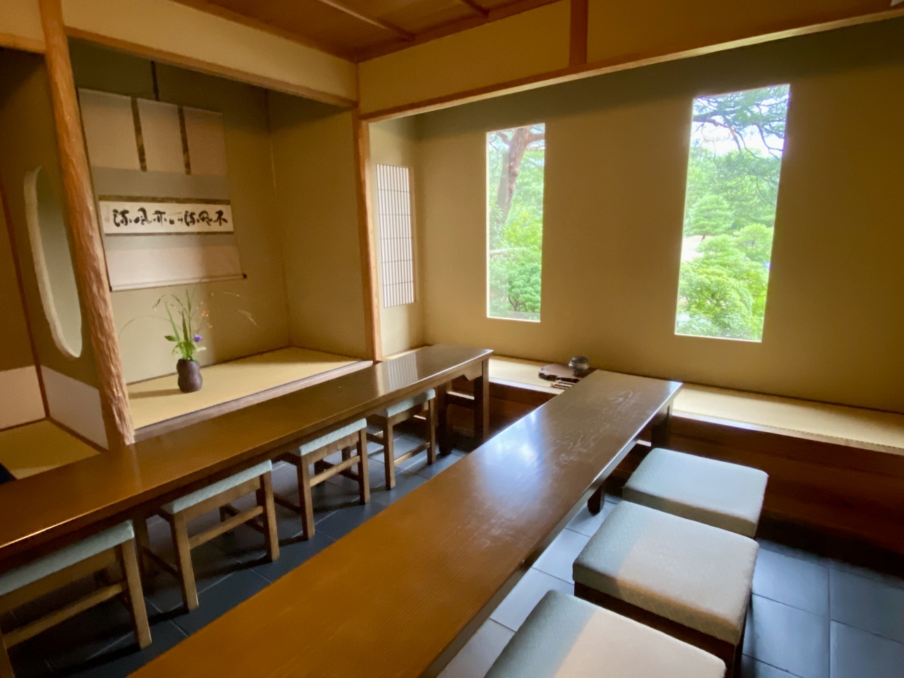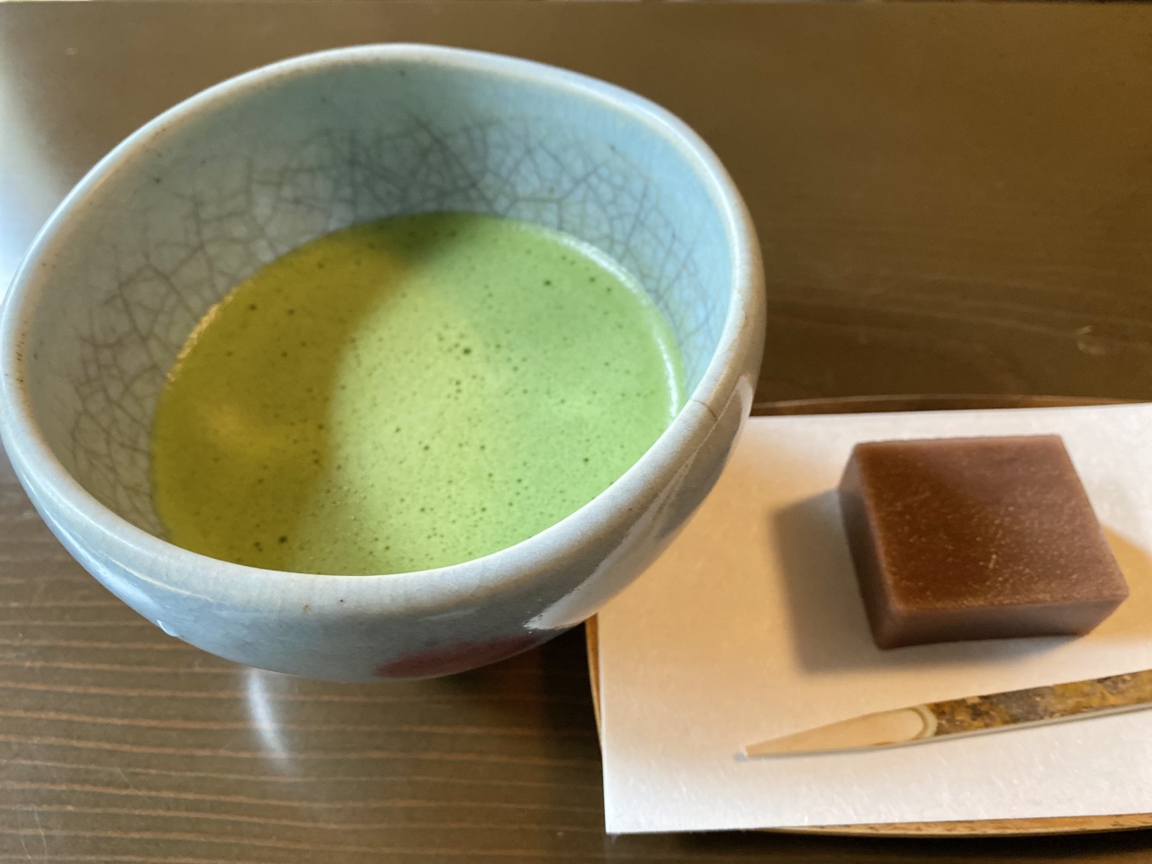 茶室「寿楽庵」で休憩しました。中に入ると生の掛軸「生の双幅」があり、庭の風景が掛軸のように眺められます。上品な和菓子をいただき、純金の茶釜で沸かしたお湯でたてたお抹茶を飲みました。