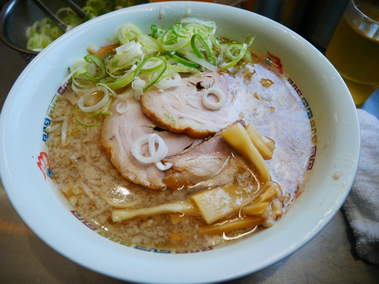 国立競技場や神宮球場近くにある24時間営業のラーメン屋さん。1階が立ち食い、2階がカウンター、3階が手ぶる席になっています。麺はストレートの太め、スープは背油系でネギ入れ放題が特徴。やや重めのラーメンですが、味は美味しかったです。