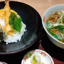 新大阪駅の一階にある蕎麦屋さん。夜は飲み屋として活用され、昼はランチとしても利用されるおみせだ。今回は15時頃から食べたので、通常の天丼定食を食べた。天丼はハーフで蕎麦は2種類から選択。天丼はハーフであるが、少し物足りない印象