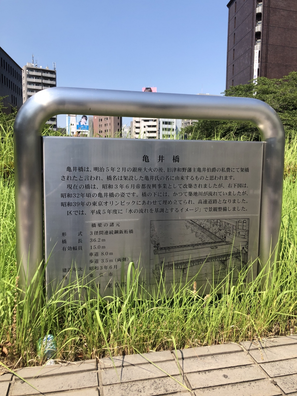 銀座から新富町に向かう際、亀井橋を通りました。設置されている案内板によると、旧津和野藩主だった亀井伯爵が私費によって架橋したことから、その名が付いたそうです。橋と言っても、川は埋め立てられているので、下には高速道路が走っています。橋自体も近代的で、特別な趣は感じられませんでした。