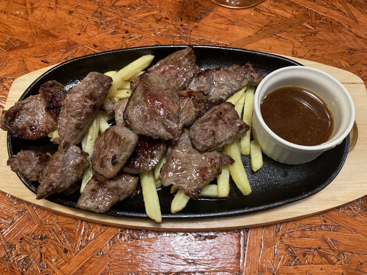 今回は、カットステーキ(200g).BBQチキン(ハーフ)、島豆腐のサラダをオーダー。カットステーキは、「肉を食べている」と感じる牛肉で、少し固めの赤身肉。BBQチキンは、バーベキュソースの甘いタレ、「これでハーフ?」とおもうくらいのボリューム。個人的には、牛肉寄りもこちらのほうが好み。島豆腐のサラダはこれで380円と思うほどコスパ良い。焼酎の種類も豊富、カウンター席もあり、沖縄料理をつまみながら一人飲みも可能。気軽に沖縄料理を食べるならちょうどよい。