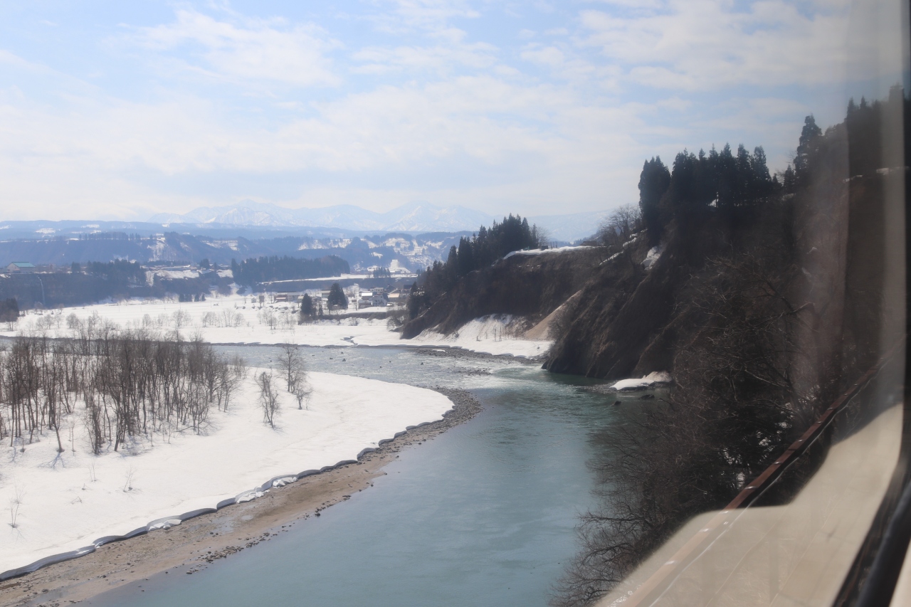 十日町から乗車した上り飯山線の車窓から楽しめました。4月でしたが、沿線には積雪が残っていました。豪雪地帯を走る飯山線はおもに信濃川沿いに進みます。県境を越えて長野県に入ると、その名も千曲川にかわります。