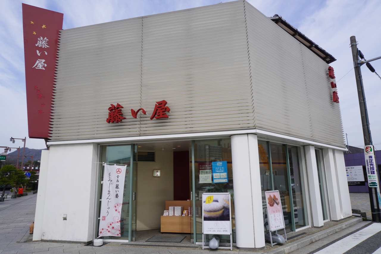 藤い屋 宮島口店は、広電宮島口駅を出てすぐ。白い外装のおとなしい印象のお店です。宮島にはもみじ饅頭のお店がたくさんありますけど、藤い屋は最大手。県内でもにしき堂と並んで双璧ですよね。ふかふかのカステラ生地に餡子のすっきりした甘さ。もみじ饅頭は名前は平易ですが、完成度の高いお菓子です。