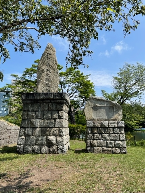 中島公園にある日本庭園]の入口近くに建てられています。大小の石碑が並んで立っていて、札幌の開拓に当たり尽力した4名の人物の功績が称えられています。広大な中島公園には石碑やモニュメントが多くありますが、その中でも大きく立派だったので印象に残りました。