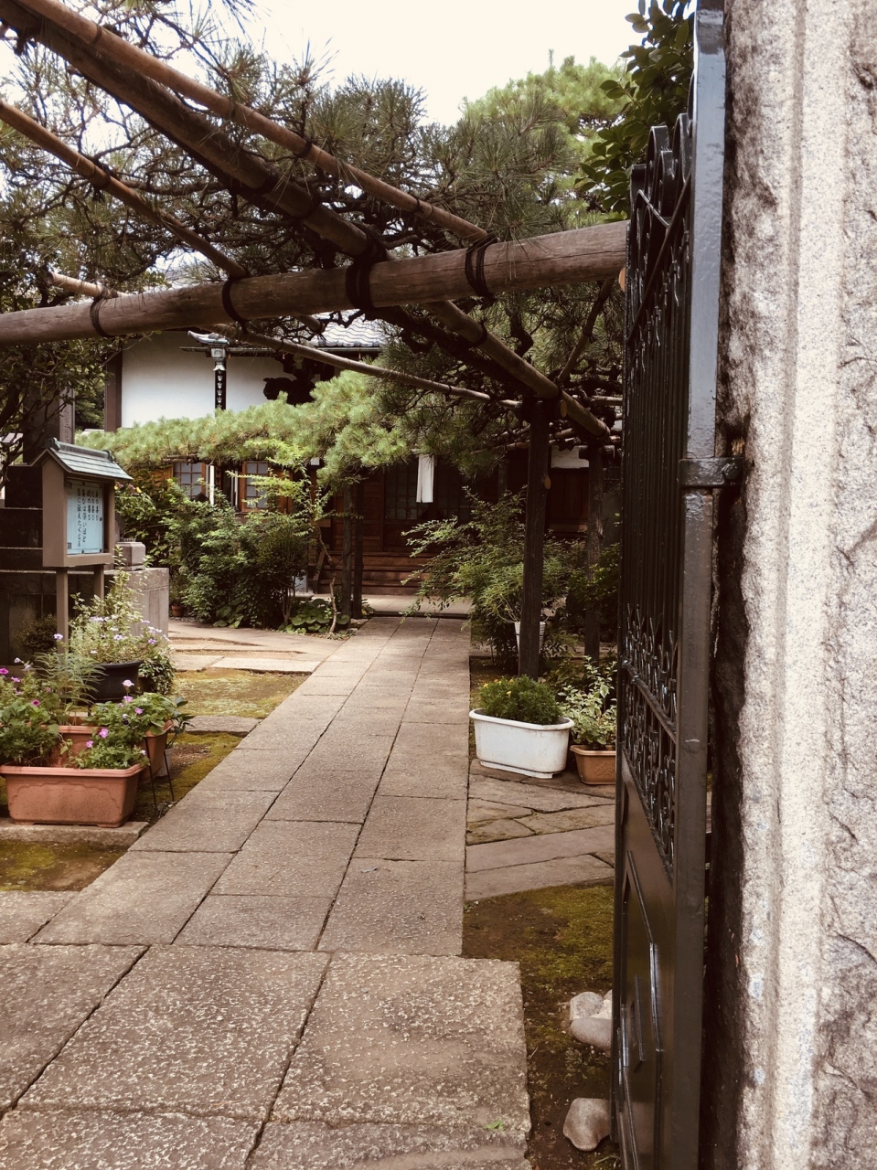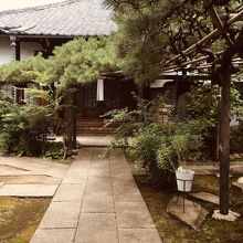 寺の門にある木々が上を見上げるほど高い木でした。境内入ると石の道が真っ直ぐに伸びていて、植木鉢がいくつか置いてありました。本堂の前には大きな松が横たわっていて、松をを支える木があり、盆栽のような松でした。