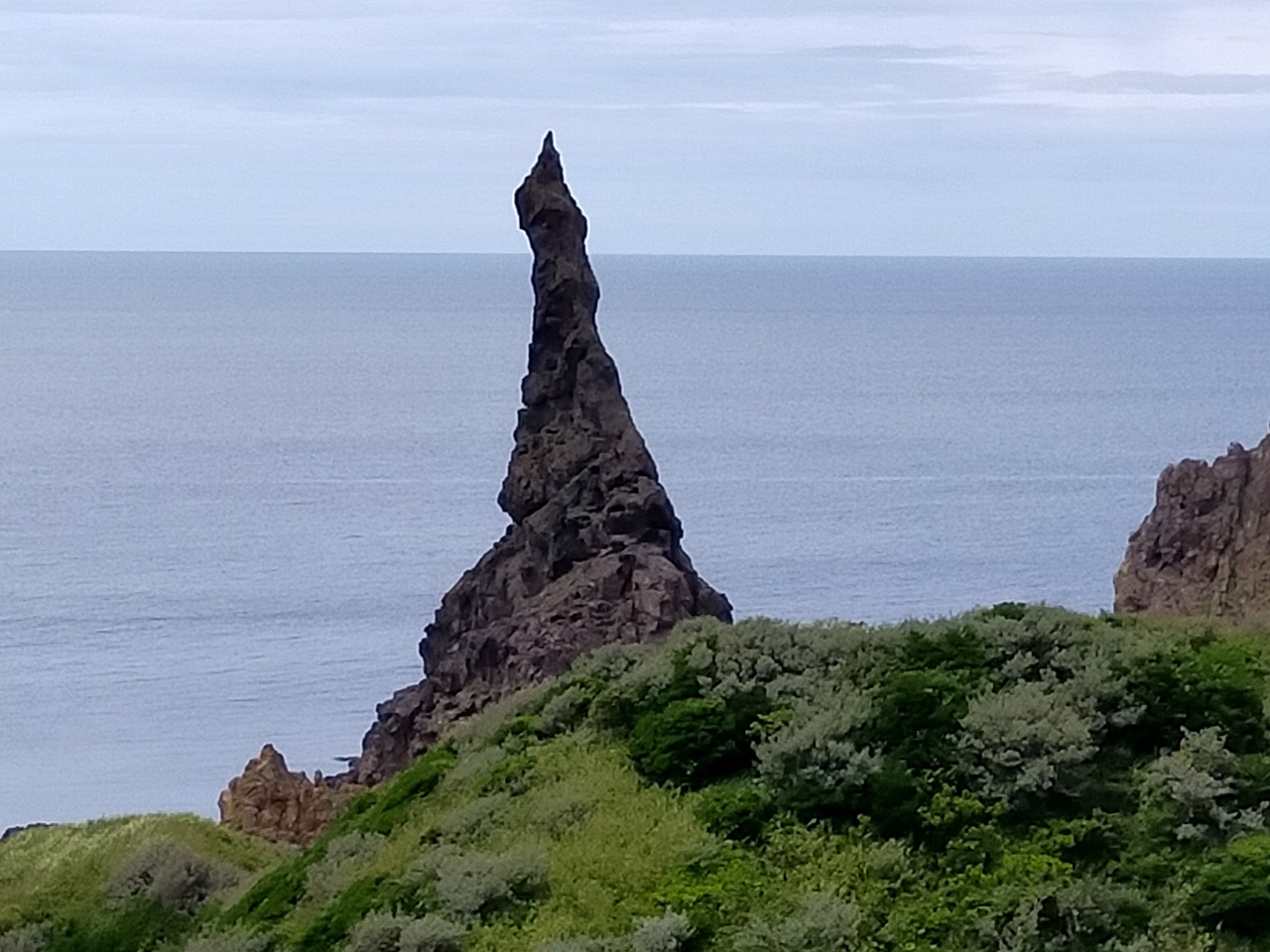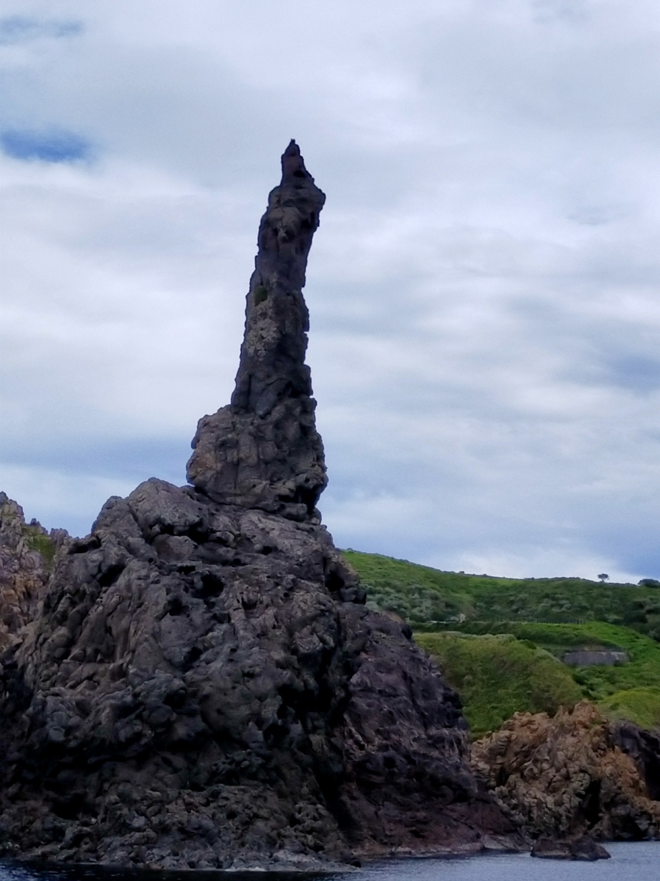 浦郷港からの観光船には乗って海側から見る方法と、国賀海岸駐車場から海岸まで坂を下って陸側から見る方法があります。両方行きましたが、陸側からはロ一ソク岩で観音の形は、海側でした。角度によるので、観光船がうまく見える位置に寄ってくれる際に見学できます。