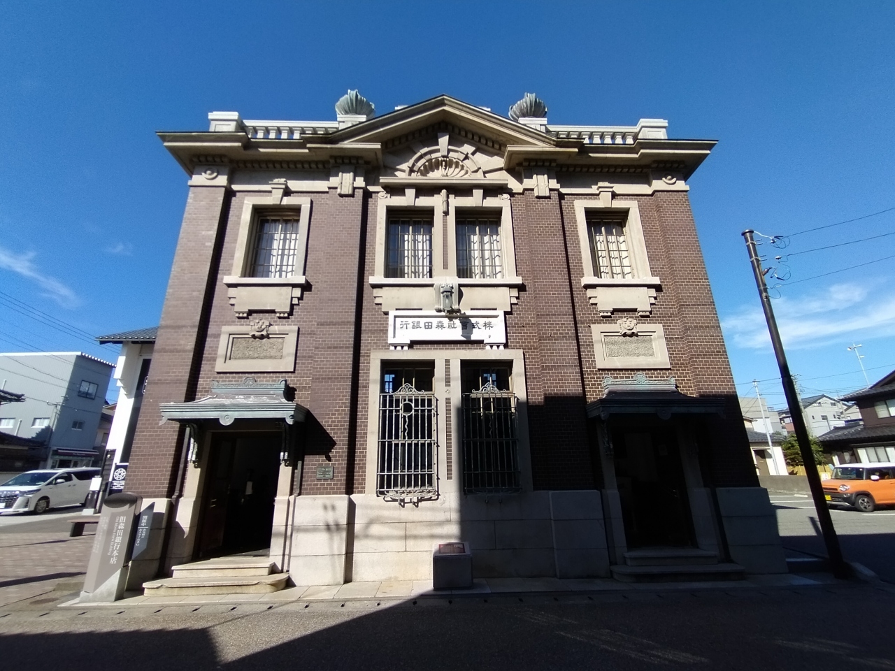 北前船の廻船業者であった森田家当主の森田三郎右衛門によって、個人経営で設立した森田銀行の旧本店として今から100年ほど前の大正9年に建てられた建物が、銀行の役目を終え公開されています。