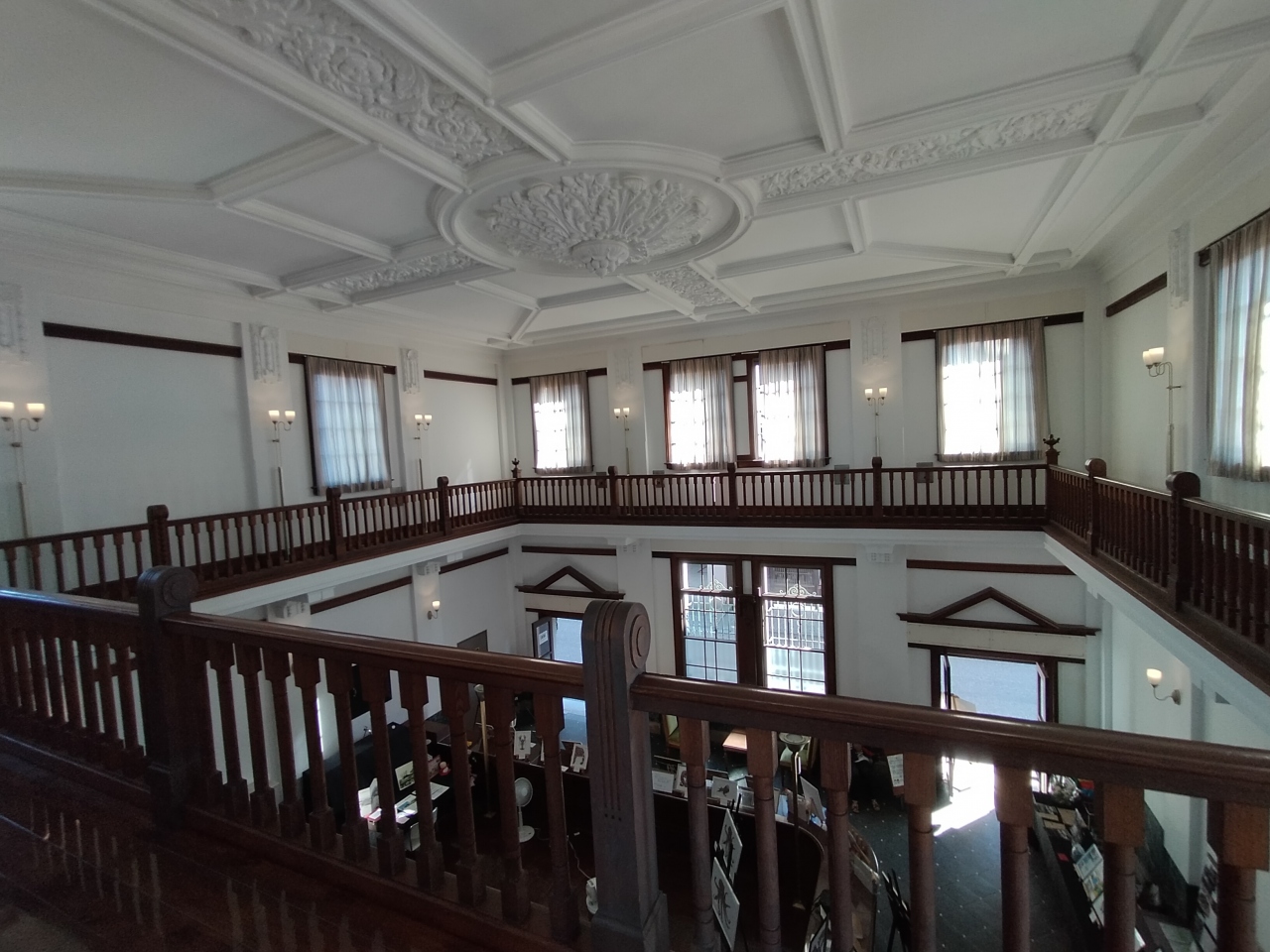 茶色のタイル張りの外観と吹き抜けになった高い天井には豪華な漆喰模様が施されていて、典型的な明治大正時代の貴重な銀行建築の建物でした。