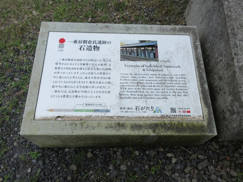朝倉氏遺跡へ向かう途中に、西山光照寺跡を通りました。そこには日本遺産の説明書きのプレートがありました。一乗谷朝倉氏遺跡の石造物として、西山光照寺の石仏が載っていました。その割には、辺りは寂しい雰囲気だなと思いました。