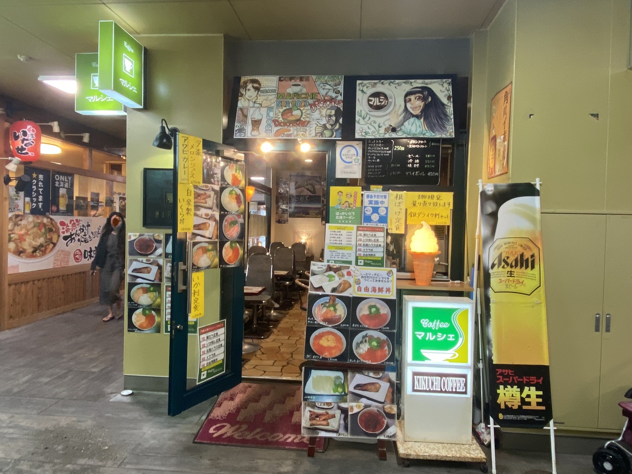 函館観光の時は必ず寄ります。函館駅前にも市場がありますが、こちらの市場は駅から15分ほど歩きますが地元の方も利用するという「自由市場」を利用します。喫茶マルシェの店内は狭いですが、回転は速いので待つ価値があります。