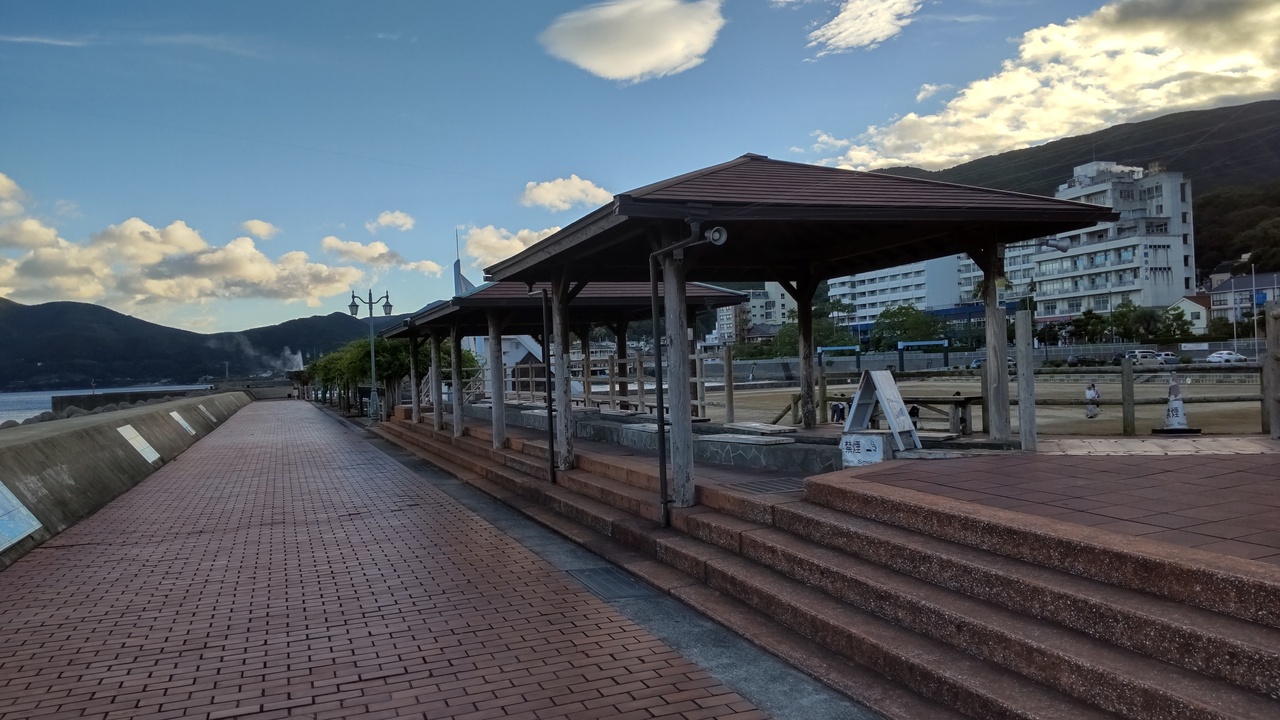 小浜温泉の中心街に近い公園のビーチ沿いの長い足湯です。看板には【日本一の足湯】と唄われています。海を見ながら足湯に脚を入れて座ることができて特に夕方のサンセットの時間はいい雰囲気に浸る事もできます。泉質もよく無料で楽しめる足湯