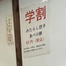 『学割 みたらし団子・あべ川餅 50円』の 貼り紙を 発見しました。