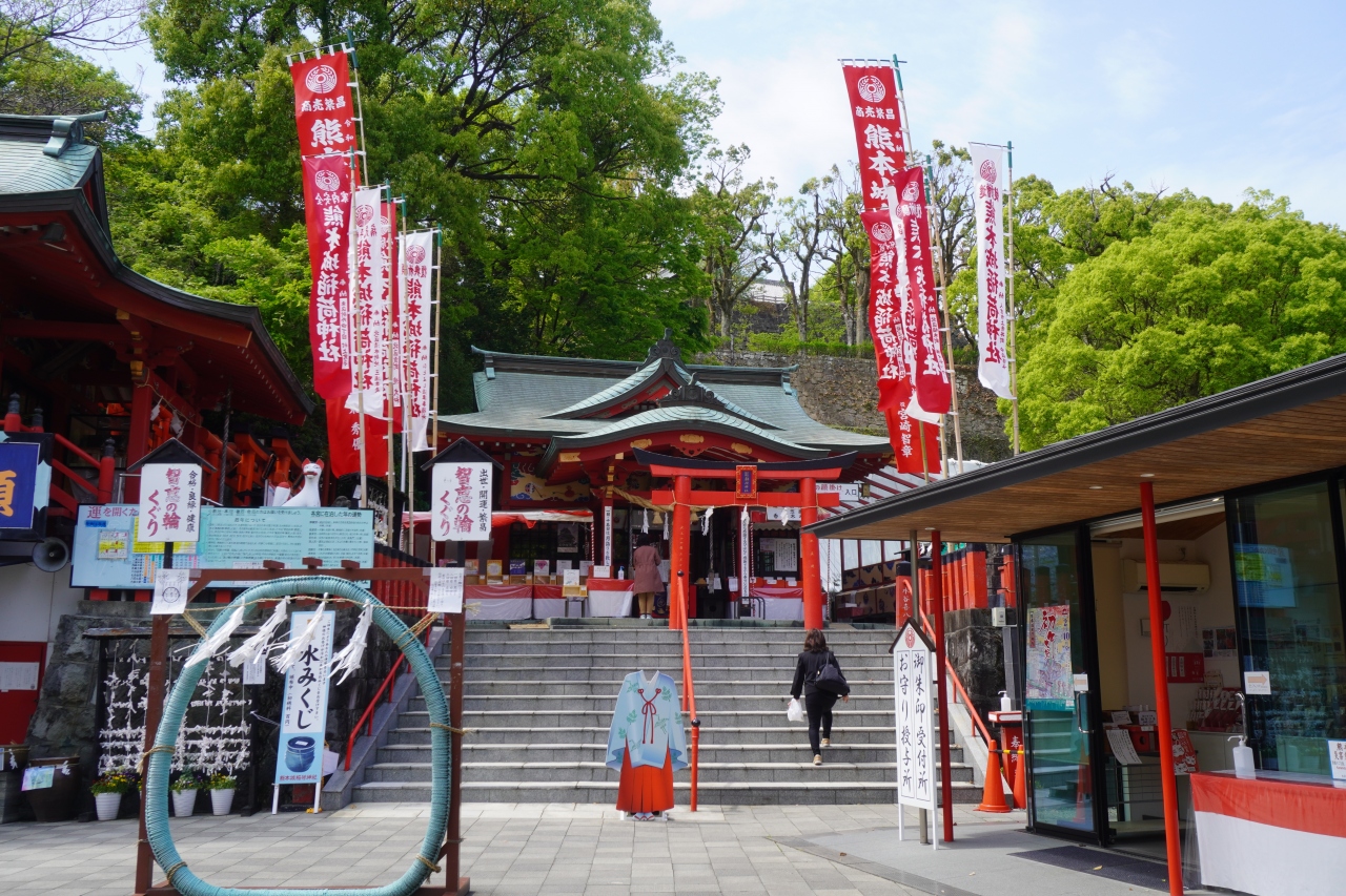加藤清正が肥後国に入国するにあたり、居城となる熊本城の守護神として稲荷社を勧請して創建。開運厄除祈願とかの看板や赤い社殿が派手派手で、それだけでも活気を感じます。