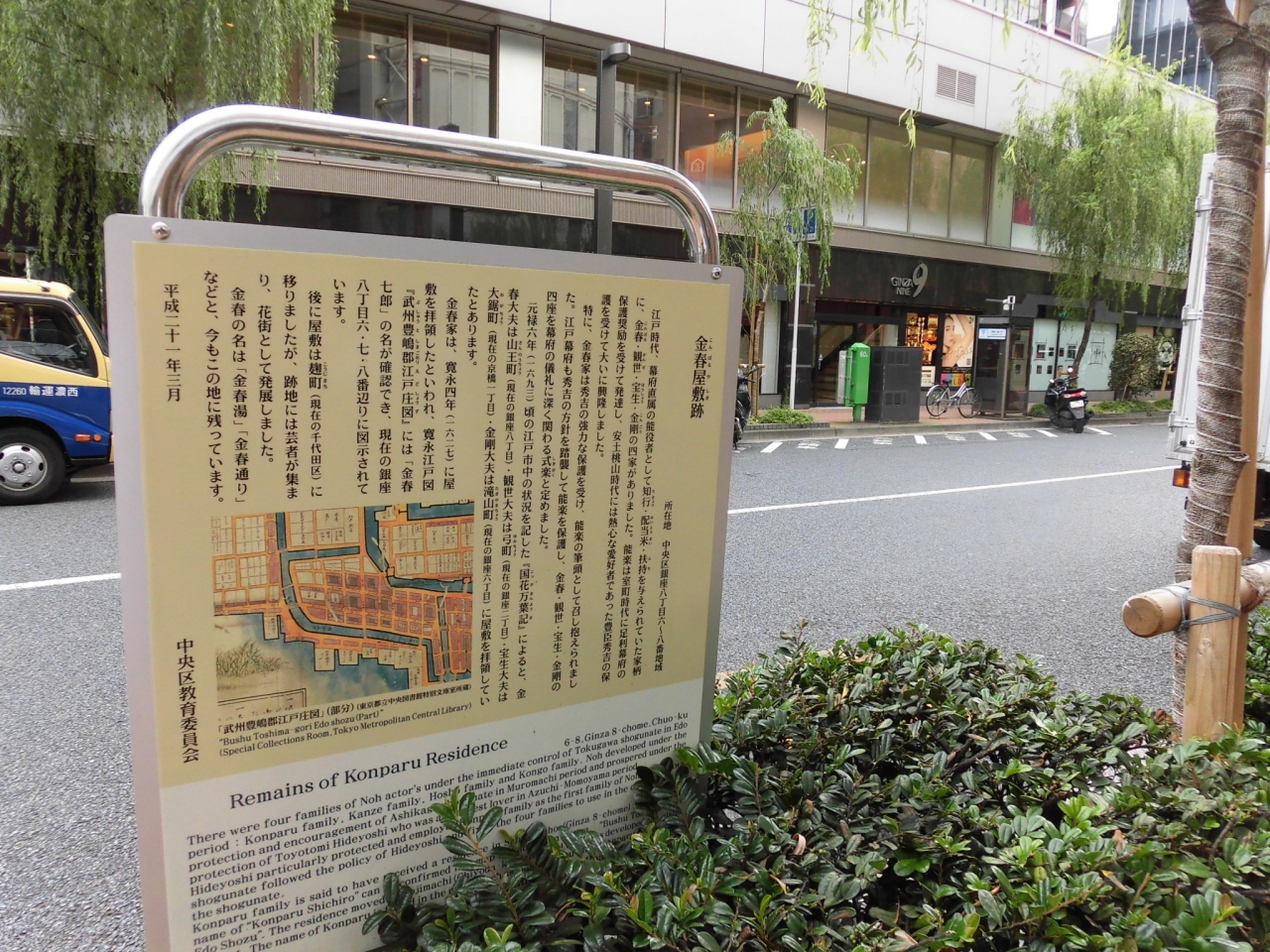 銀座8丁目付近の御門通り沿いを散策していた時に、道路わきに案内表示板が立てられていたので立ち寄ってみました。江戸時代に、能楽金春流の屋敷がこの辺りにあったことを記した。能楽なのでおそらく稽古用の舞台などもあった屋敷だと思いますが、残念ながら痕跡となりそうなものな何もありませんでした。