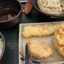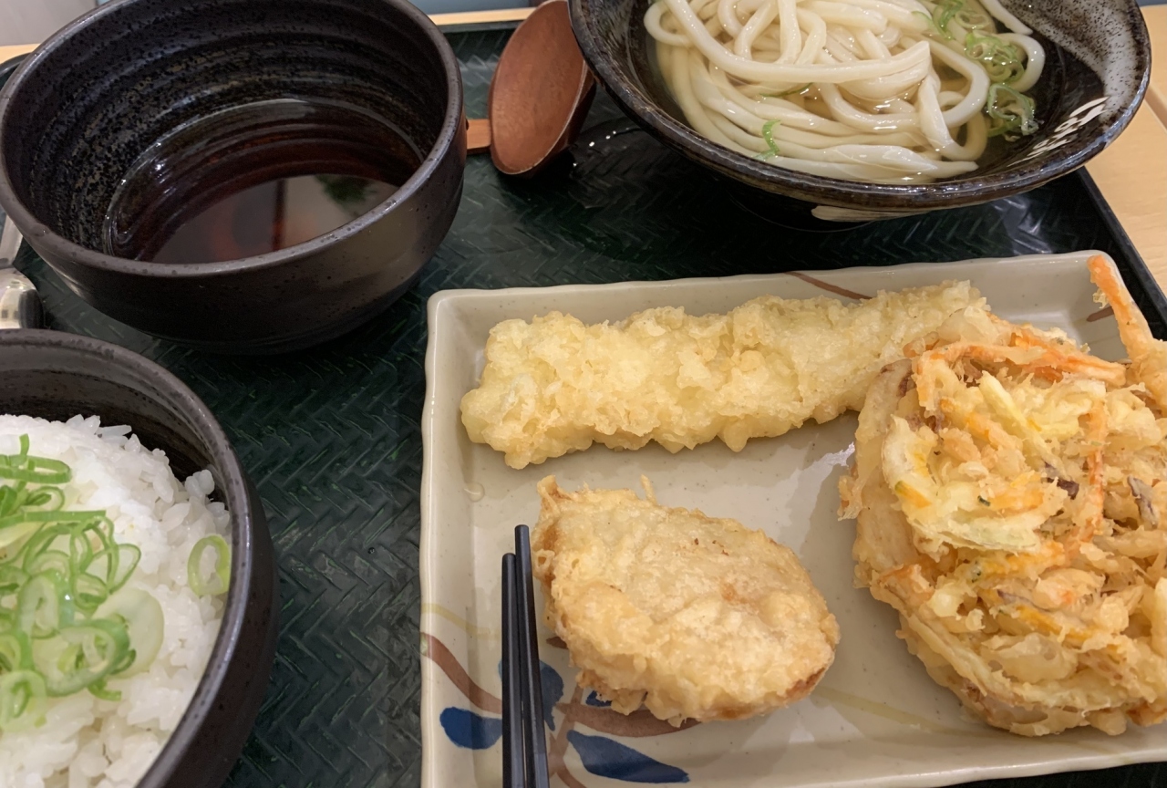 福岡空港内にあるうどん屋さんです。安い早い美味いの三拍子揃った、使いやすいお店です。自分なりにアレンジして楽しめます。天ぷらが購入できますが、テレビで見た天丼にするアレンジをするため、白ご飯も注文しました。