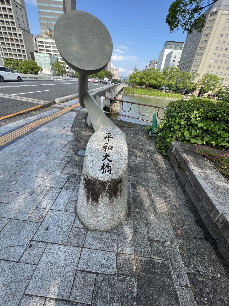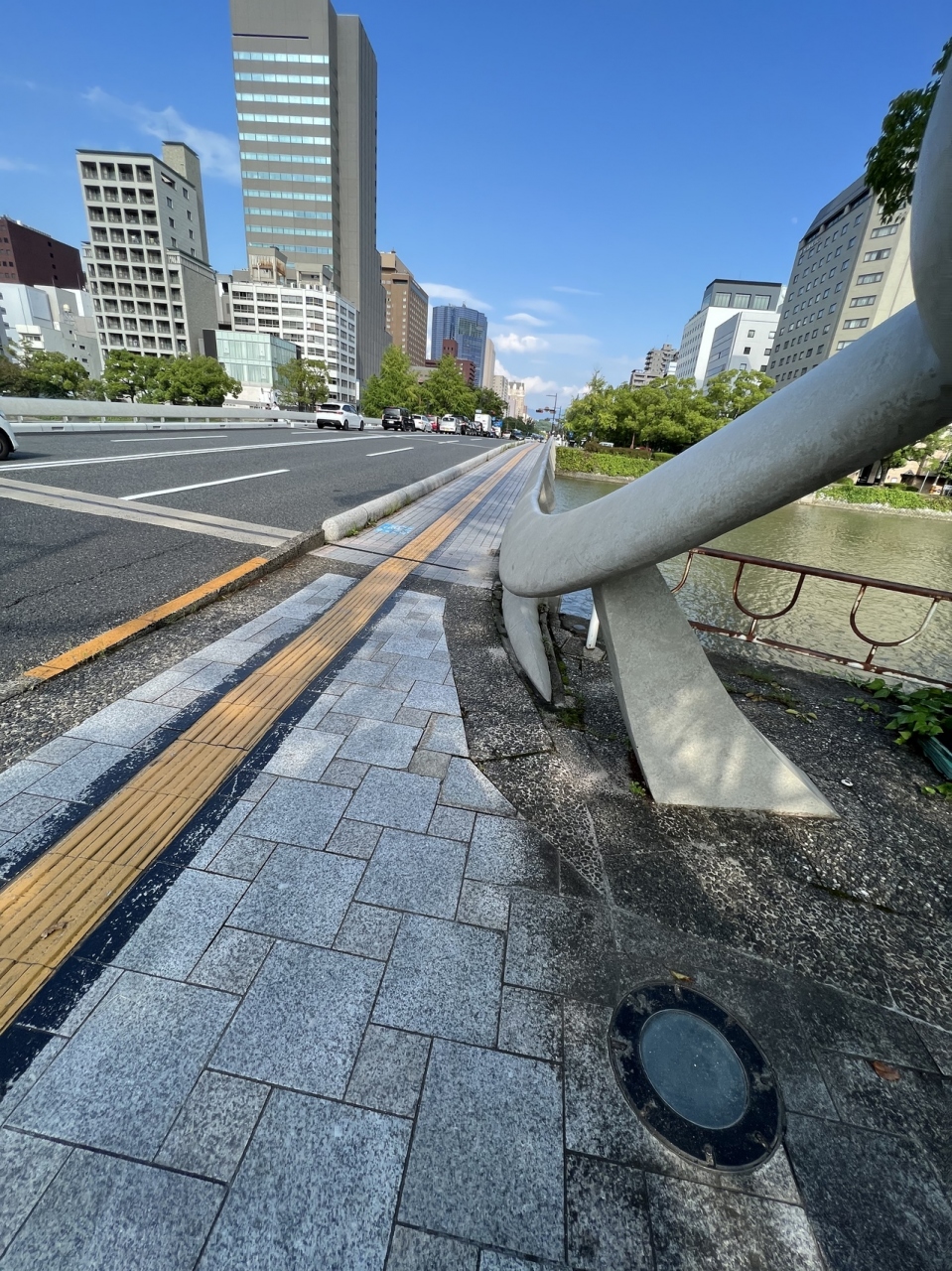 元安川にかかる橋で、この橋を西側に渡ると、平和記念資料館があります。橋の歩道のうち、北側は広いんですが、南側がすごく狭い。橋までは平和大通りの歩道が広いので、急に歩道が狭くなって