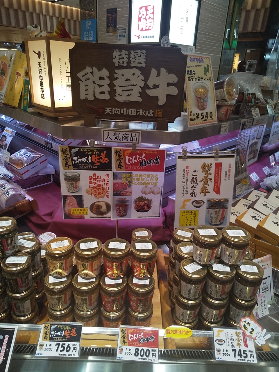 改札の外のお土産販売エリアにあります。肉系で金沢のイメージとは違いますが、能登牛です。ご飯だれが瓶に入って美味しそうでした。能登牛の肉のうま味が、白いご飯にはとても合います。お土産にしては、800円くらいでリーズです。おすすめです
