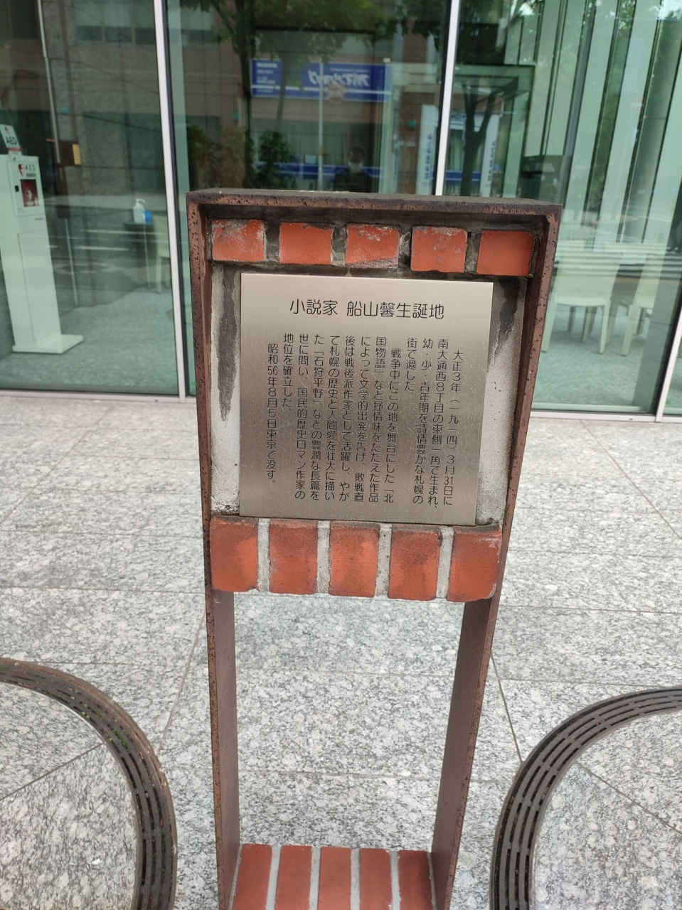 大通公園の南側ある第一三共札幌支店ビルの東にあるきる説明文付きの記念碑です。公園周辺を朝散歩していて見かけましたが、文学には疎く、札幌出身の作家さんですが名前は存じあげませんでした。こういう碑は知るきっかけにはなるのはいいですね。
