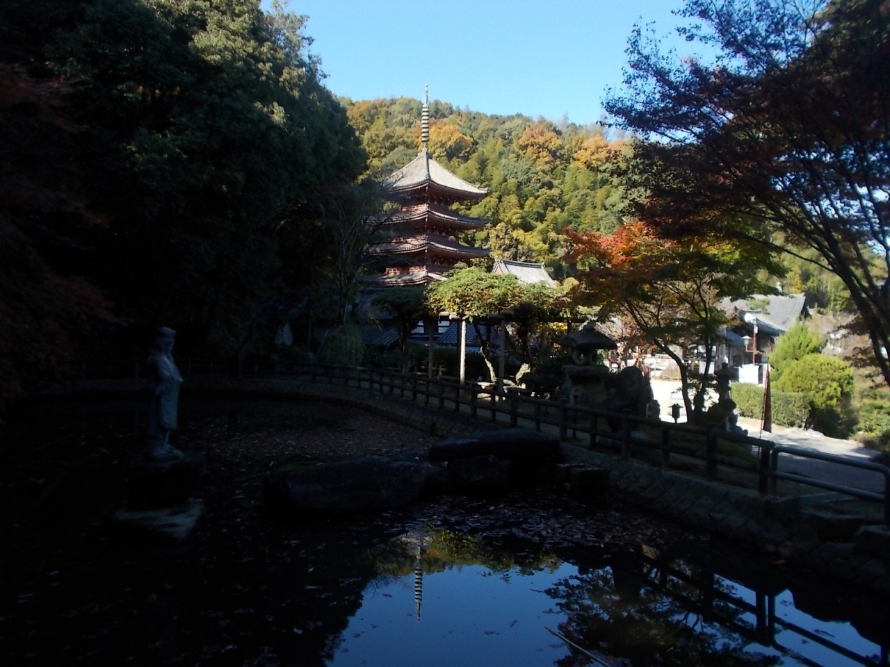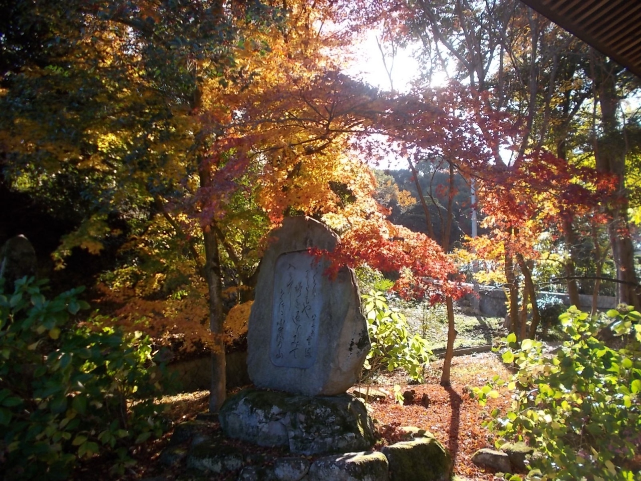 ここで紅葉が一番多いのは入口付近の十王堂というお堂の裏で、一見入れなさそうなエリアですが、よく見ると入ることができ、歌碑や佐戸小学校跡(明治44年から昭和8年まであったらしいです)の石碑などが立っています。国宝の五重塔や本堂があるあたりには紅葉はあまりありません。五重塔から少し離れたところにある池の畔にもカエデが植えられていますが、日当たりが悪いせいか色がくすんでいてきれいに見えません。