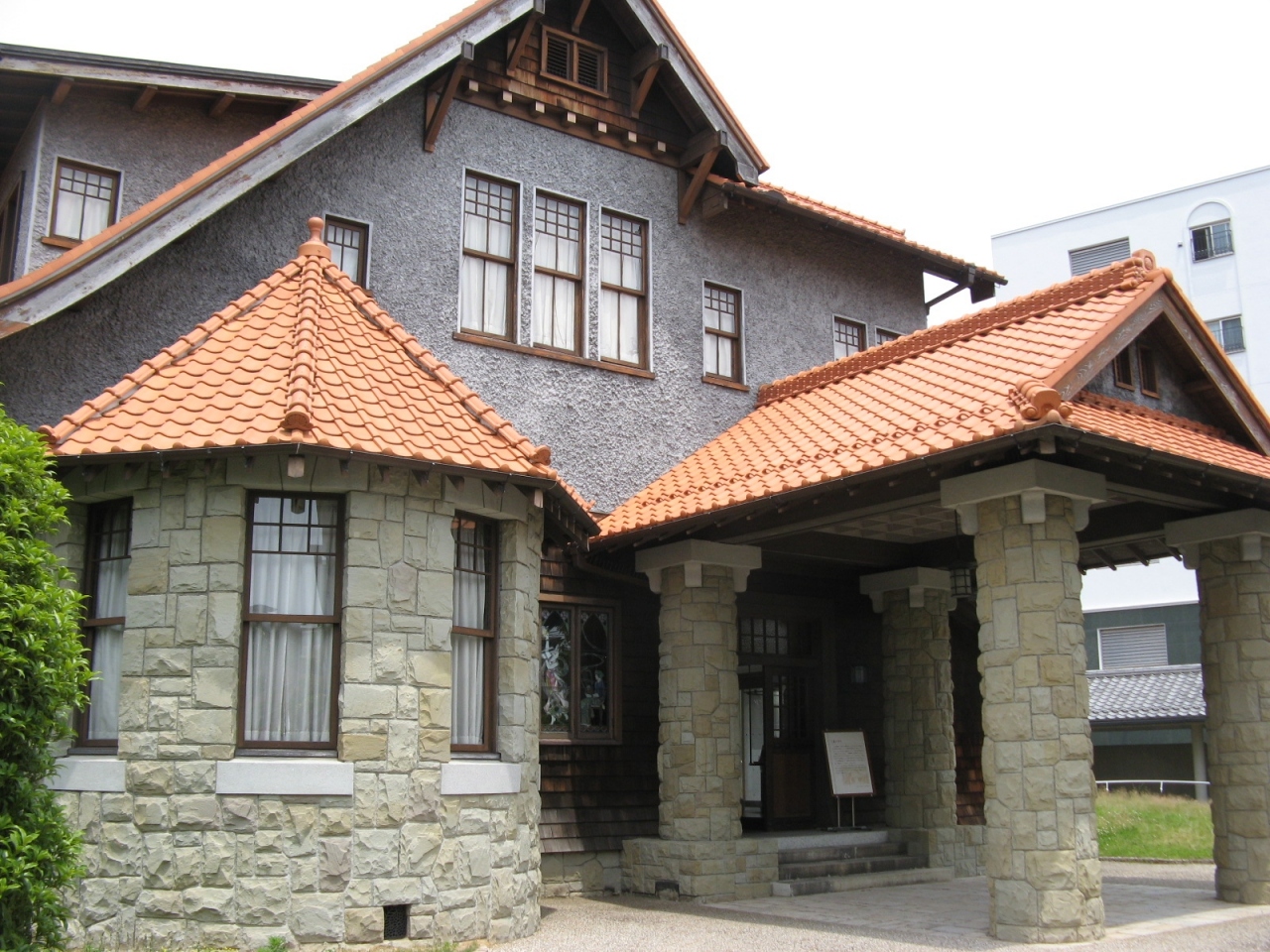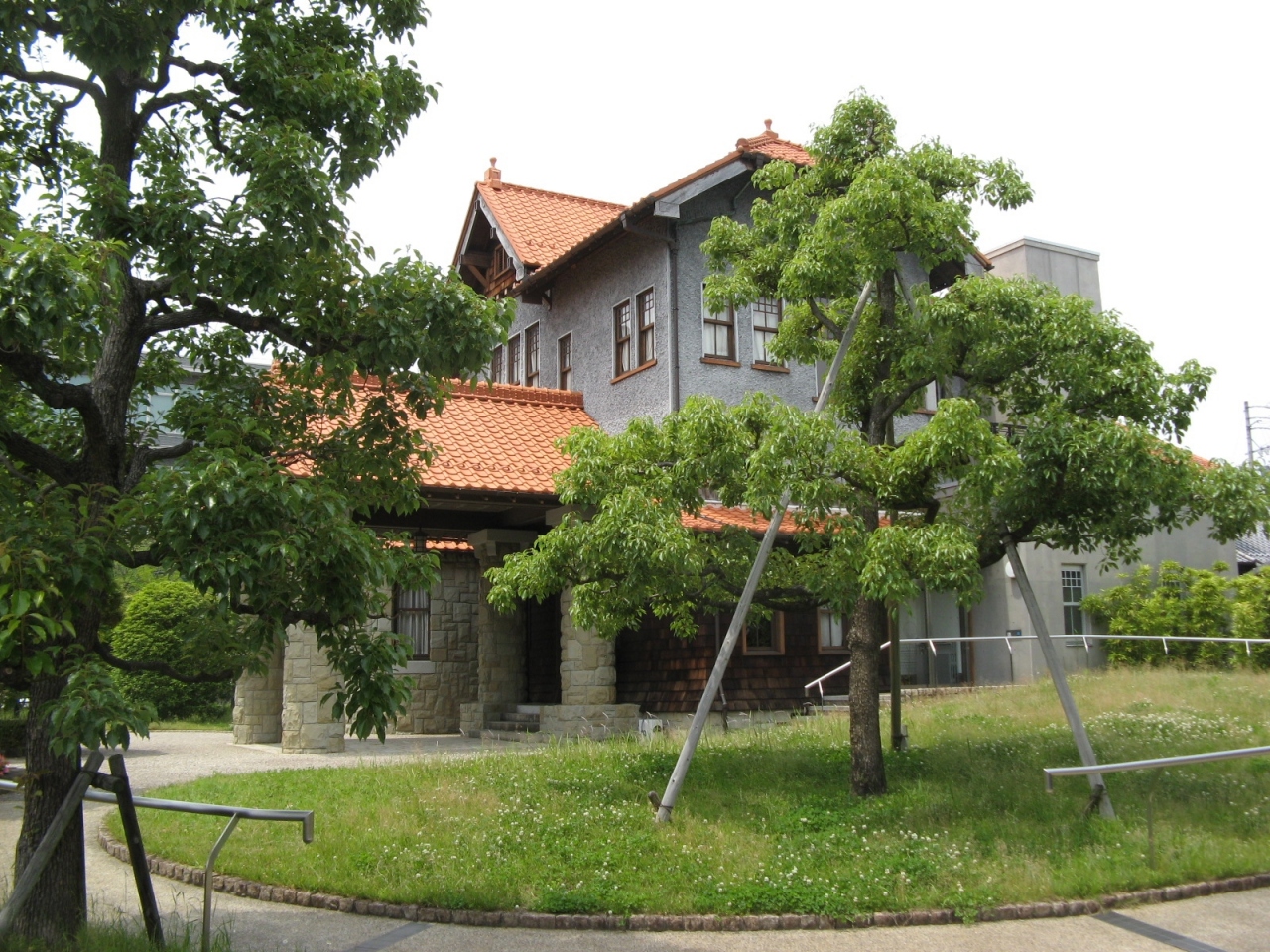 大正九年(1920年)頃に建造され、日本の女優第1号と言われている川上貞奴が“電力王”福澤桃介と暮らしていたとされる建物です。よく手入れされた庭にオレンジ色の洋風屋根、石垣のようなデザインの外壁、ステンドグラスが美しい大広間に伝統的な和室など和洋折衷の邸宅は大正ロマンを感じさせるもので見応え十分でした。