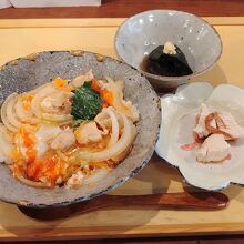 ランチの青セット(親子丼・小鉢二種・おうどん)を注文。