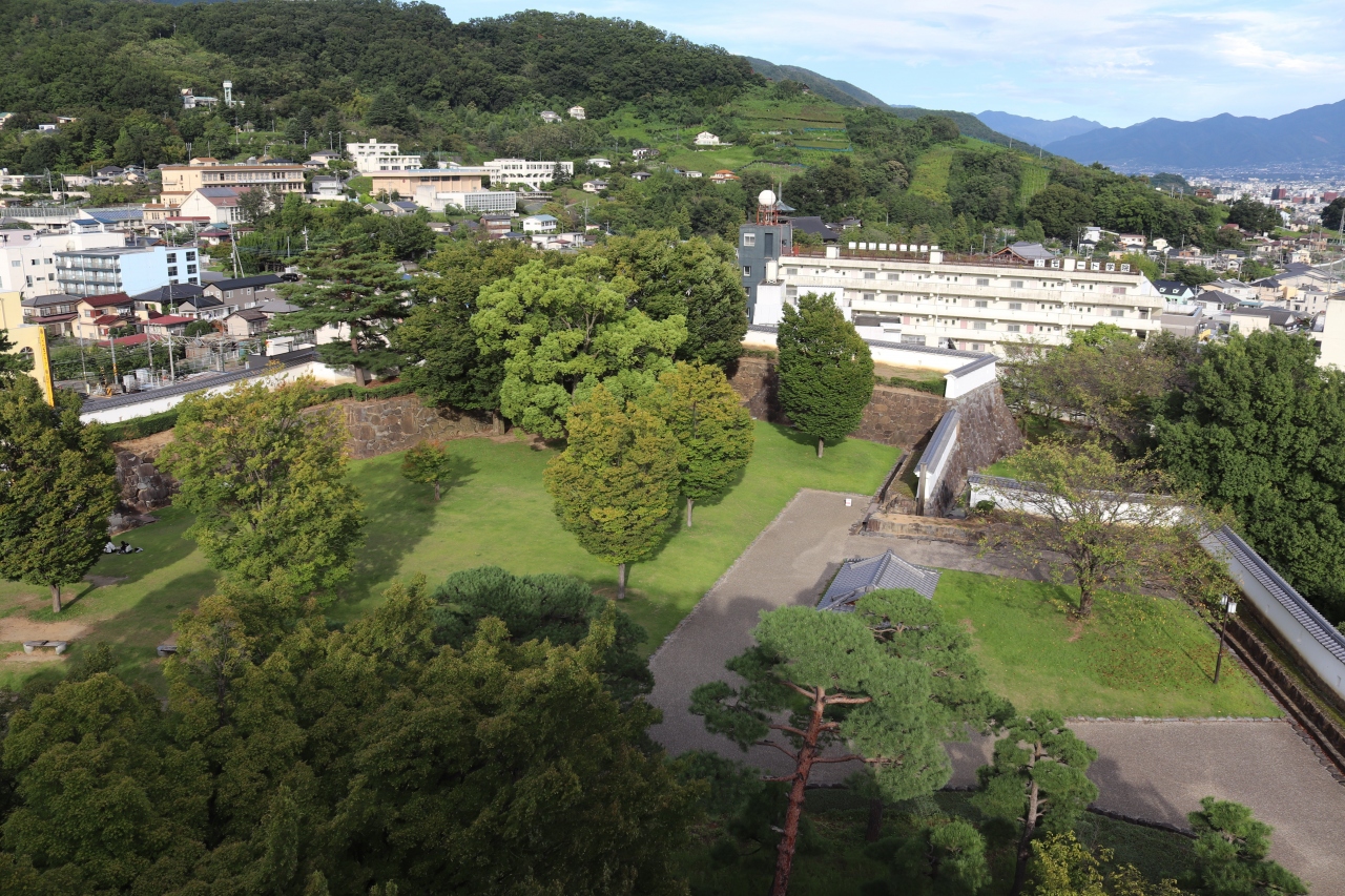 甲府駅からすぐ、かつての甲府城の城郭を利用した公園で、市民や観光客の憩いの場となっています。高台の公園からは富士山や南アルプスなども眺めることができます。当時から残るのは石垣ぐらいで、建物は当時の復元です。