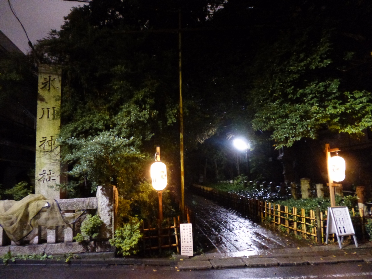 夕食後に六本木方面から赤坂方面まで徒歩で向かう途中、氷川坂を通りました。赤坂氷川神社の東北側に沿って走る裏通りで、通り沿いに灯かりが少なく、暗闇の中に浮かび上がる氷川神社の提灯の姿が印象的でした。小雨が降っており、神社の境内に敷かれた石畳が雨で反射する姿も神々しさを感じさせました。