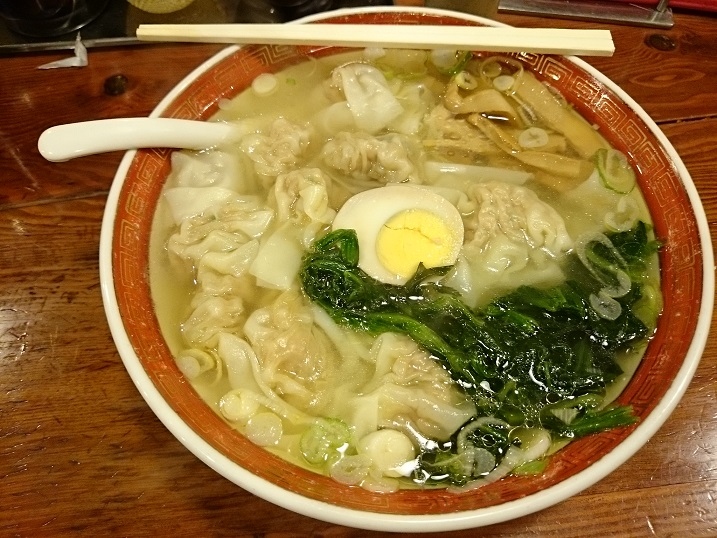 大塚駅南口からすぐの場所にあるワンタンメンが人気のラーメン屋さんです。夕食でワンタンメンをいただきました。具はゆで卵、ホウレン草、肉ワンタン、メンマ、ネギで、コシのある細麺と上品な味の塩系スープの一品です。ワンタンが美味しく、ワンタンの旨味の解けたスープも絶妙の味。とっても美味しいワンタンメンだと思います。ご馳走様でした。