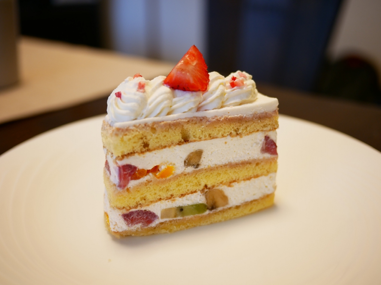 ---苺、バナナ、キウイ、ミカンをサンドしたショートケーキ。やはり、生クリームが上質です。丁度、ショートケーキを渇望していたので、桃のショートケーキと合わせて頂いて、大変満足出来ました。
