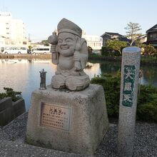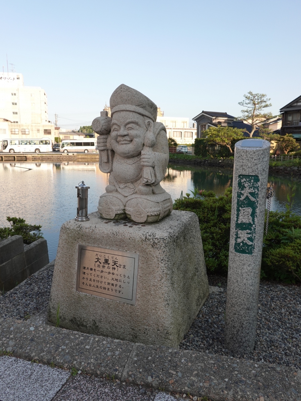 和倉温泉散策の楽しみの一つが七福神巡りでした。最初に足を運んだのが、この日の宿「虹と海」のすぐ近くにあった「渡月橋 大黒天像」です。渡月橋のほとりで微笑む愛らしい姿は癒されます。夜はライトアップされた渡月庵を背景に見ることができ、こちらも必見の光景でした。