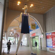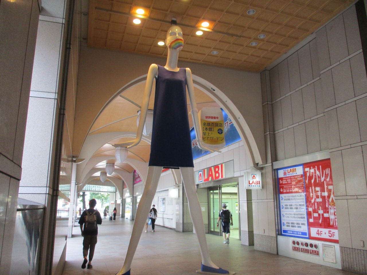 名鉄百貨店のメンズ館前に立っています。8月のナナちゃんは涼し気な紺のワンピースに虹のもようが入ったマスクをしていました。昭和48年生まれとはビックリ、初めて知りました。本業は名鉄百貨店の広報部員だそうです。