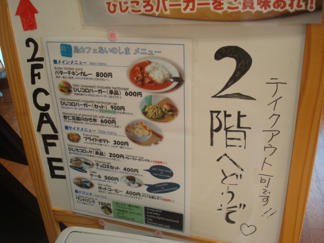 相島特産のひじき入りコロッケを使用したひじコロバーガーが売りのようで、目立つように看板が出ていたり、メニューの上の方に書かれていたりしていました。場所は島の駅あいのしまの2階です。