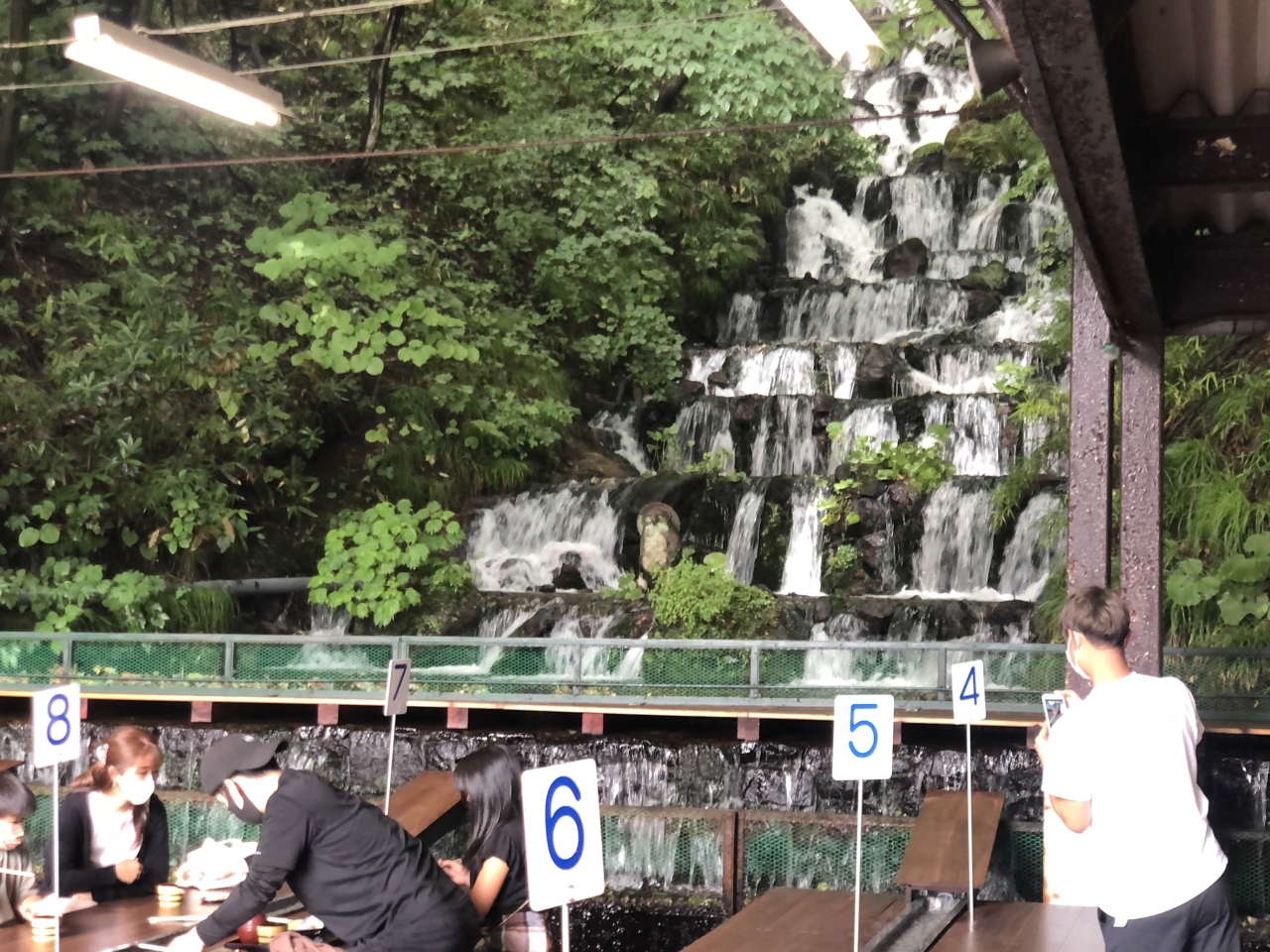 家族を伴って福島市をドライブ、流しそうめんの店吾妻庵を訪れた。狭い山道をかなり上っていく大自然のただなかにある店。市内から車で30分以上、かなり人気の店で、10組以上の行列ができていた。流しそうめんの店であるが、このご時世、個別の注文も可能、ますの塩焼きとクレソンの天ぷらがついて1,800円がおすすめメニュー、その他ます、いわな、天ぷら定食も選べる。