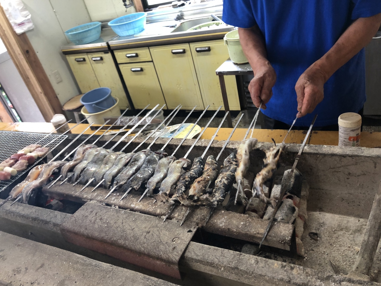 店の外では渓流釣り堀がある。天然のいわなやにじますが放流され、釣りを楽しめる。