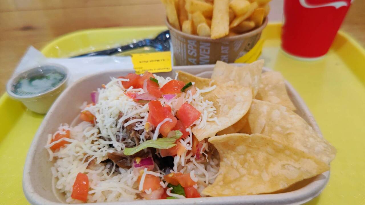 何度かテイクアウトで利用経験はあるのですが、電車の乗り継ぎついでのお昼でイートインを利用しました。平日の13時くらいで、ギリギリ席を確保。いつもはタコスやナチョスを選んでいるので、今日は気分を変えてブリトーボウルにしてみました(ライトサイズのセットで1000円くらい)。ランチメニューは特になくて、セットか単体かの2択です。