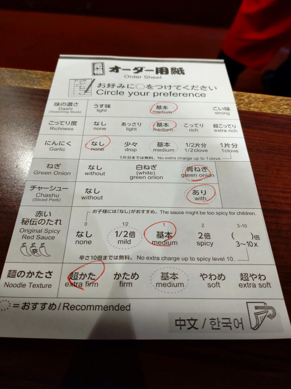 池袋駅東口から徒歩10分弱。文芸坐の近くにあります。おなじみの一蘭方式で、ラーメンを食べるのに集中できます。超かたの麺は、小麦の匂いがして美味。スープもお休みの日は、結構並んでいて、待つことも多い。また、最近は小さな子供連れのお客さんも多い気がします。博多ラーメンとしては破格の900円超で、替え玉も200円超なので、以前よりもさらに高級ラーメンになった気がする。飲んだあとに気軽にいけなくなったかも。