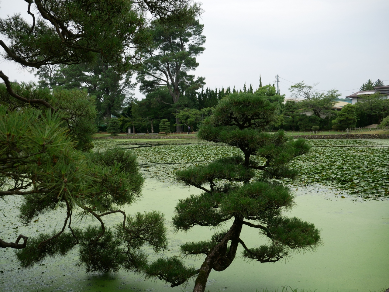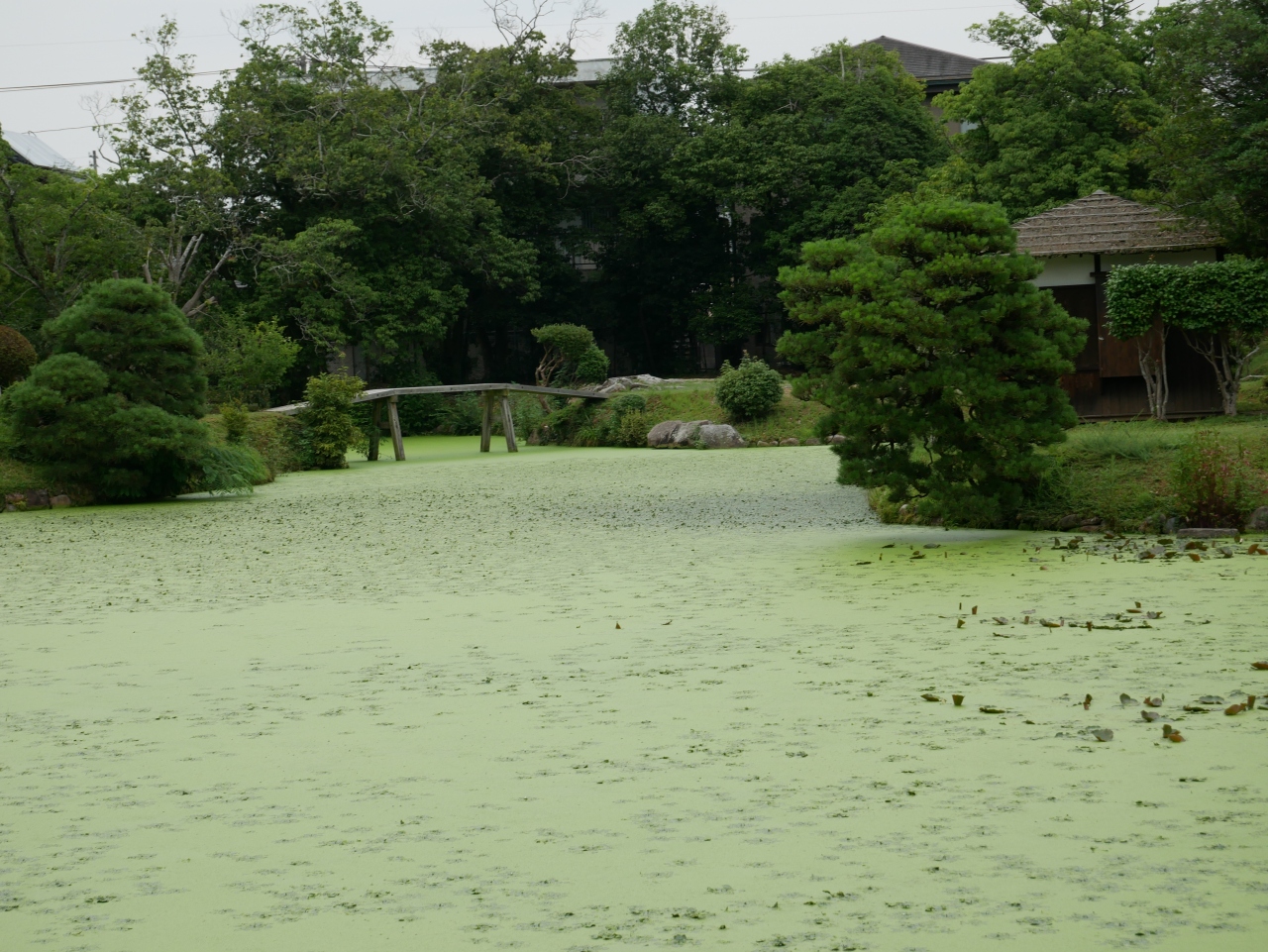 暑い時期なんでしかたがないとは思いますが、池が緑の藻や葉っぱに覆われて、よく見えなかったのだけが残念