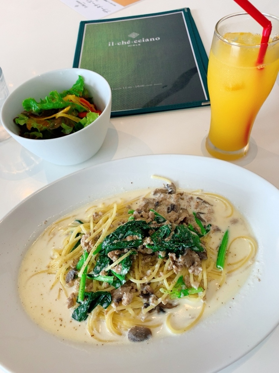 アクアイグニスを訪れた時に、こちらのお店でランチしました。 平日にもかかわらず結構混み合っていました。 ランチセットメニューは結構リーズナブルで、サラダ+パスタ+ドリンクで1600円。 私は、ほうれん草と菰錦豚のクリームスープパスタをチョイス。